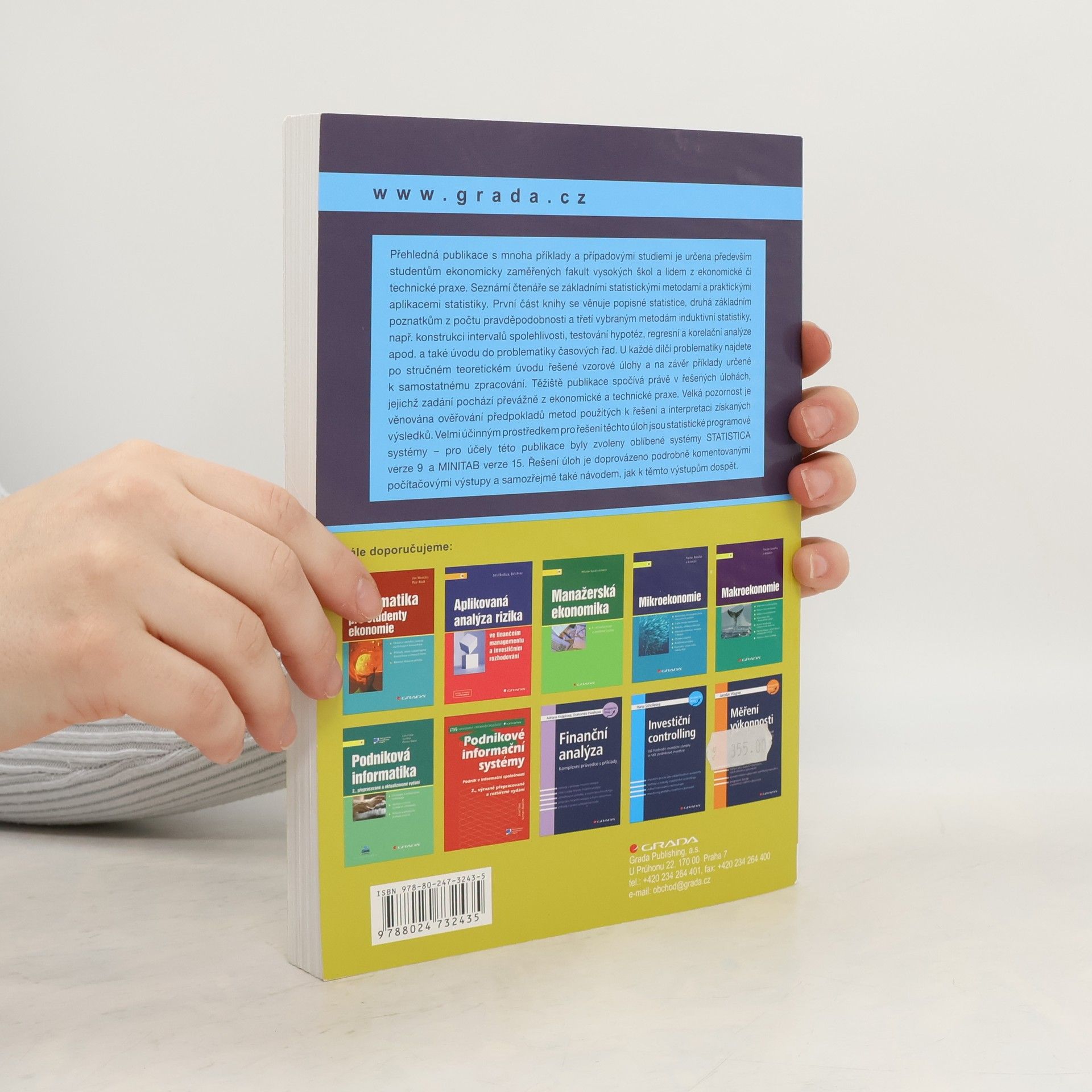 Přehledná publikace s mnoha příklady a případovými studiemi je určena především studentům ekonomicky zaměřených fakult vysokých škol a lidem z ekonomické či technické praxe. Seznámí čtenáře se základními statistickými metodami a praktickými aplikacemi statistiky. První část knihy se věnuje popisné statistice, druhá základním poznatkům z počtu pravděpodobnosti a třetí vybraným metodám induktivní statistiky, např. konstrukci intervalů spolehlivosti, testování hypotéz, regresní a korelační analýze apod. a také úvodu do problematiky časových řad. U každé dílčí problematiky najdete po stručném teoretickém úvodu řešené vzorové úlohy a na závěr příklady určené k samostatnému zpracování. Těžiště publikace spočívá právě v řešených úlohách, jejichž zadání pochází převážně z ekonomické a technické praxe. Velká pozornost je věnována ověřování předpokladů metod použitých k řešení a interpretaci získaných výsledků. Velmi účinným prostředkem pro řešení těchto úloh jsou statistické programové systémy - pro účely této publikace byly zvoleny oblíbené systémy STATISTICA verze 9 a MINITAB verze 15. Řešení úloh je doprovázeno podrobně komentovanými počítačovými výstupy a samozřejmě také návodem, jak k těmto výstupům dospět.
