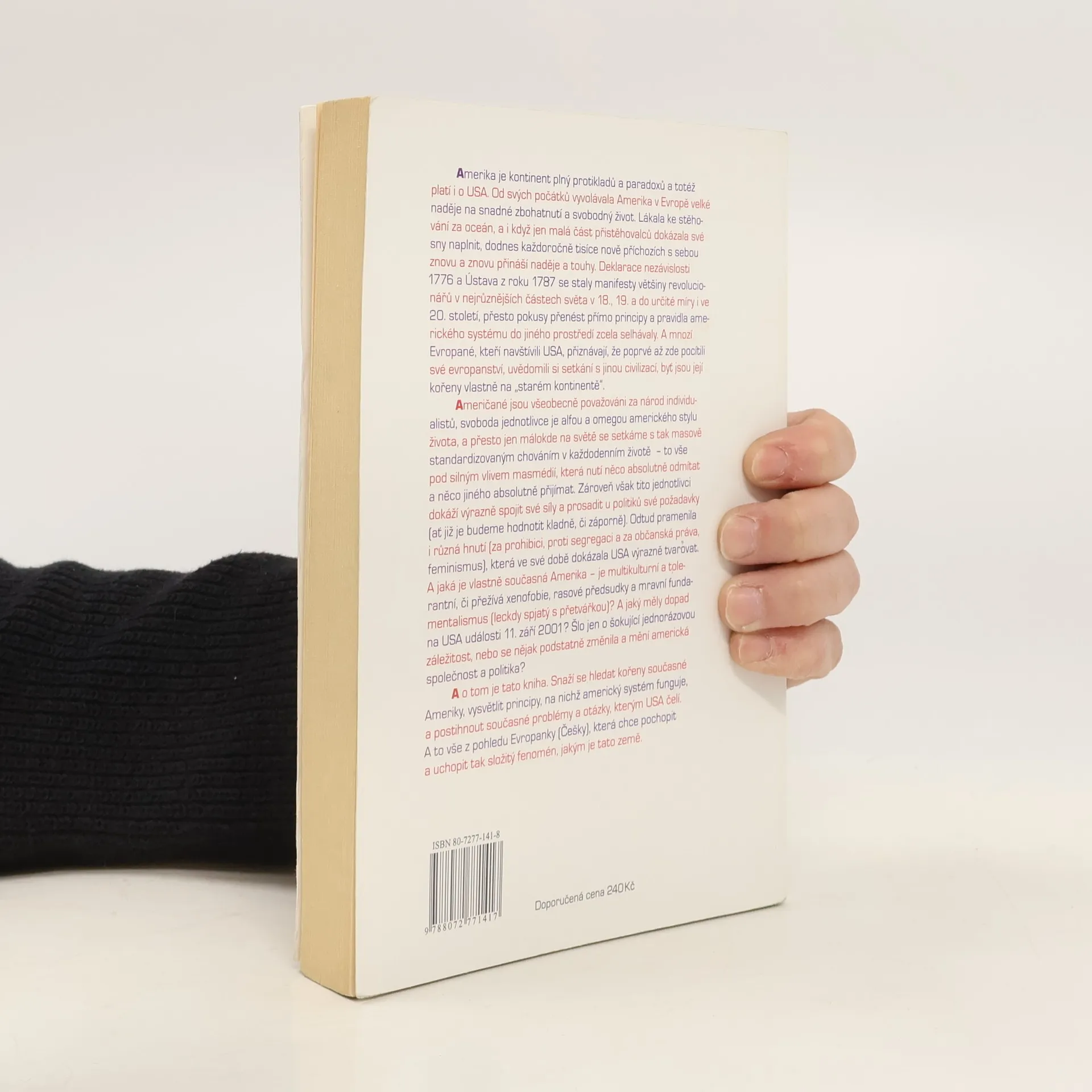 Amerika je kontinent plný protikladů a paradoxů, což platí i pro USA. Od svých počátků vyvolávala velké naděje na zbohatnutí a svobodný život. I když jen malá část přistěhovalců naplnila své sny, každoročně přicházejí tisíce nových, nesoucí si naděje a touhy. Deklarace nezávislosti a Ústava se staly manifesty pro revolucionáře po celém světě, avšak přenést principy amerického systému do jiného prostředí se ukázalo jako neúspěšné. Mnozí Evropané, kteří navštívili USA, si uvědomili své evropanství a setkání s jinou civilizací, jejíž kořeny sahají do Evropy. Američané jsou považováni za individualisty, kde svoboda jednotlivce je klíčová, přesto se zde setkáváme s masově standardizovaným chováním, ovlivněným masmédii. Tyto jednotlivce však spojuje schopnost prosazovat své požadavky u politiků, což vedlo k významným hnutím, jako je feminismus či hnutí za občanská práva. Současná Amerika je otázkou multikulturalismu a tolerance versus xenofobie a rasových předsudků. Jaký dopad měly události 11. září 2001 na americkou společnost a politiku? Kniha se snaží hledat kořeny současné Ameriky, vysvětlit principy amerického systému a analyzovat problémy, kterým USA čelí, z pohledu Evropanky, která se snaží pochopit tento složitý fenomén.
