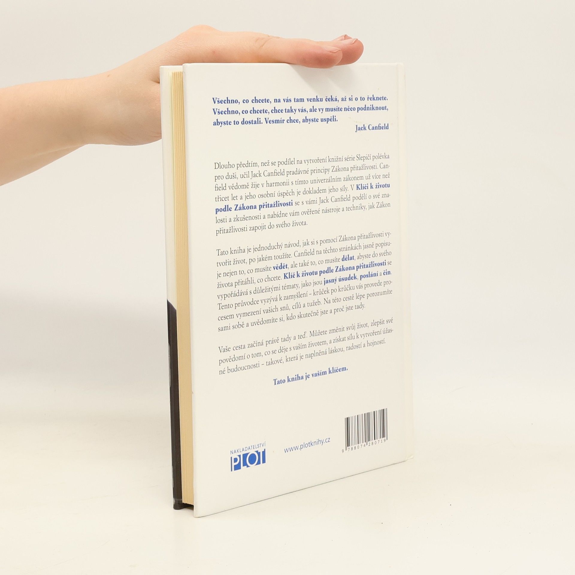 Tato kniha je jednoduchý návod, jak si s pomocí Zákona přitažlivosti vytvořit život, po jakém toužíte. Canfield na těchto stránkách jasně popisuje nejen to, co musíte vědět, ale také to, co musíte dělat, abyste do svého života přitáhli, co chcete. Klíč k životu podle Zákona přitažlivosti se vypořádává s důležitými tématy, jako jsou jasný úsudek, poslání a čin. Tento průvodce vyzývá k zamyšlení – krůček po krůčku vás provede procesem vymezení vašich snů, cílů a tužeb. Na této cestě lépe porozumíte sami sobě a uvědomíte si, kdo skutečně jste a proč jste tady. Vaše cesta začíná právě tady a teď. Můžete změnit svůj život, zlepšit své povědomí o tom, co se děje s vaším životem, a získat sílu k vytvoření úžasné budoucnosti – takové, která je naplněná láskou, radostí a hojností. Tato kniha je vaším klíčem.