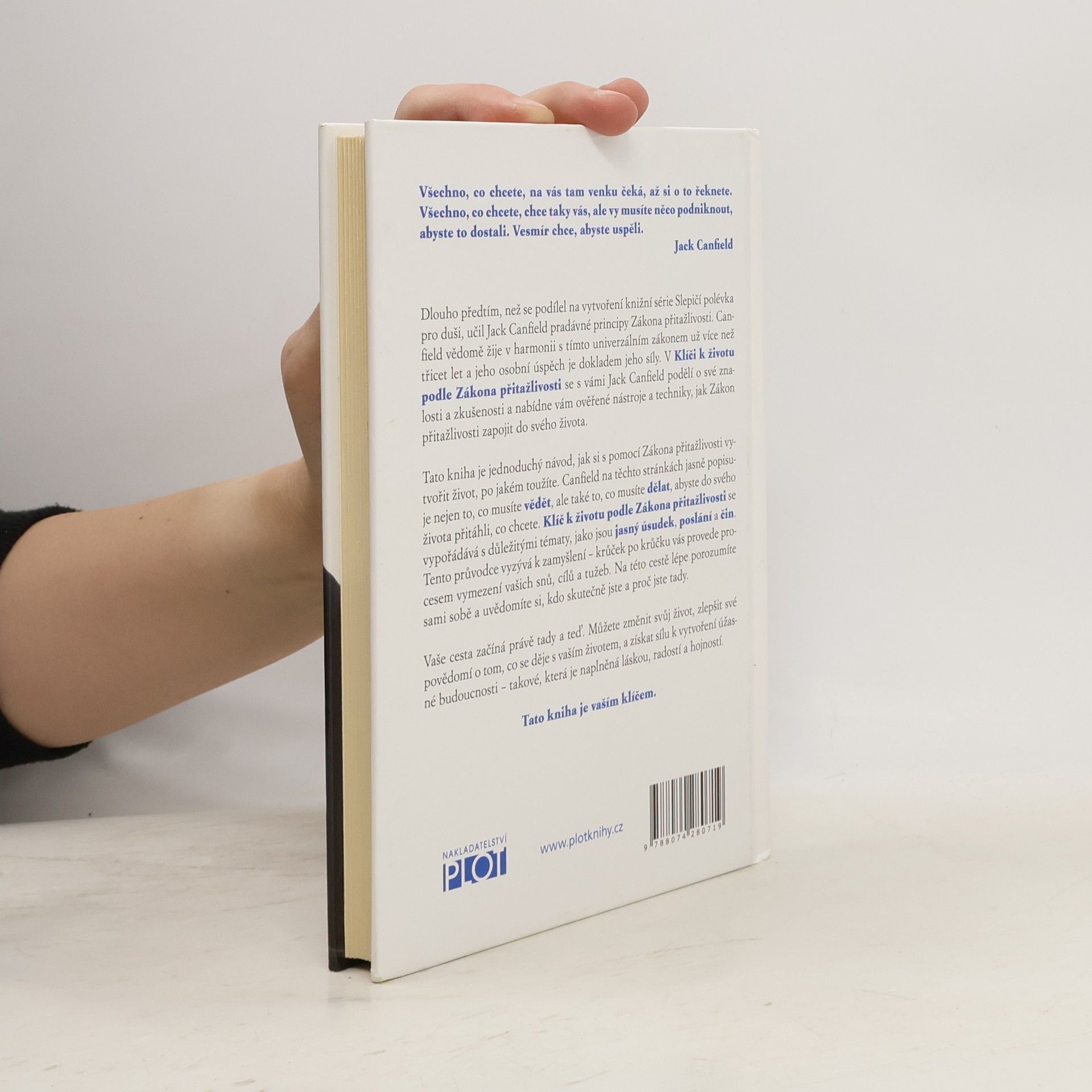 Tato kniha je jednoduchý návod, jak si s pomocí Zákona přitažlivosti vytvořit život, po jakém toužíte. Canfield na těchto stránkách jasně popisuje nejen to, co musíte vědět, ale také to, co musíte dělat, abyste do svého života přitáhli, co chcete. Klíč k životu podle Zákona přitažlivosti se vypořádává s důležitými tématy, jako jsou jasný úsudek, poslání a čin. Tento průvodce vyzývá k zamyšlení – krůček po krůčku vás provede procesem vymezení vašich snů, cílů a tužeb. Na této cestě lépe porozumíte sami sobě a uvědomíte si, kdo skutečně jste a proč jste tady. Vaše cesta začíná právě tady a teď. Můžete změnit svůj život, zlepšit své povědomí o tom, co se děje s vaším životem, a získat sílu k vytvoření úžasné budoucnosti – takové, která je naplněná láskou, radostí a hojností. Tato kniha je vaším klíčem.