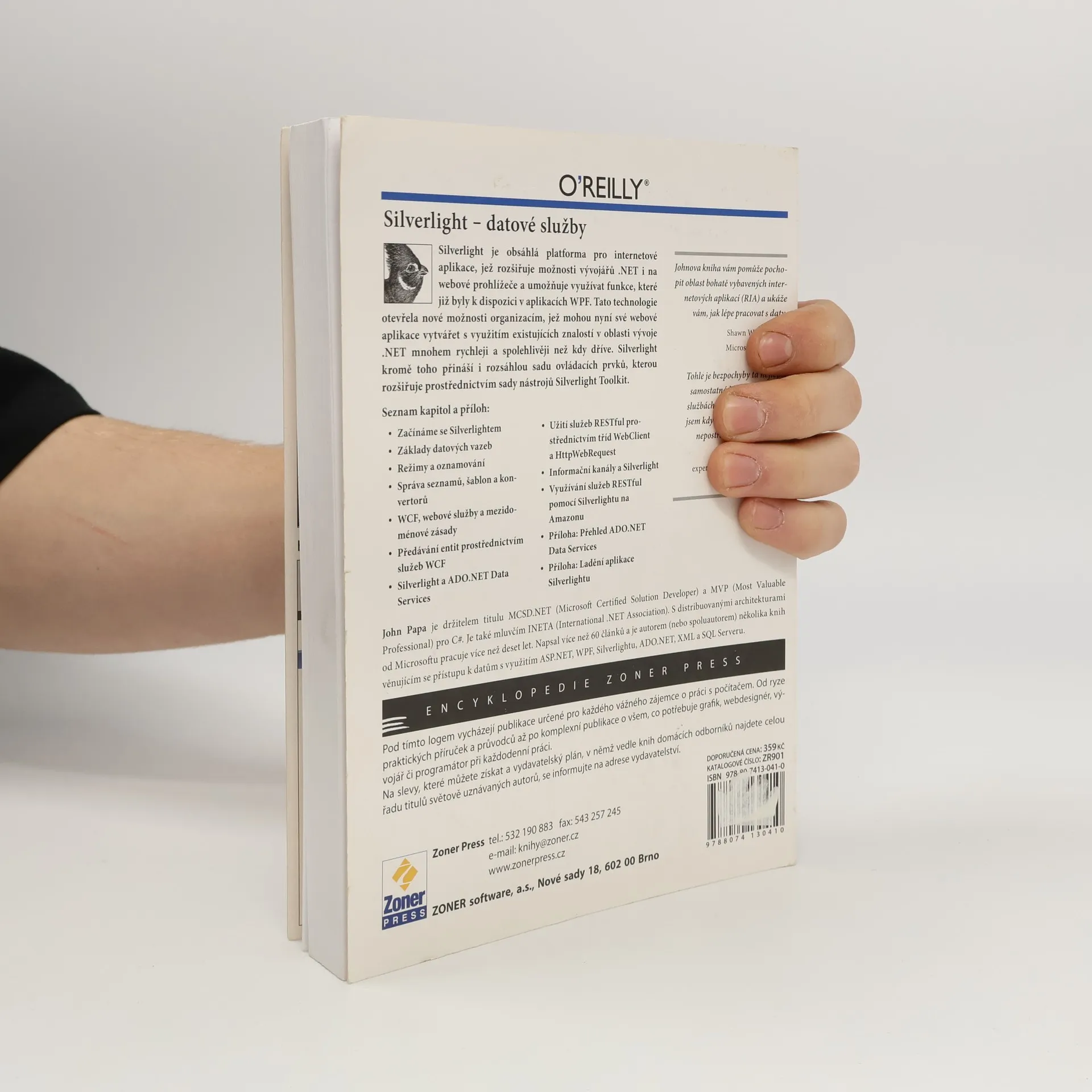 Silverlight je obsáhlá platforma pro internetové aplikace, jež rozšiřuje možnosti vývojářů .NET i na webové prohlížeče a umožňuje využívat funkce, které již byly k dispozici v aplikacích WPF. Tato technologie otevřela nové možnosti organizacím, jež mohou nyní své webové aplikace vytvářet s využitím existujících znalostí v oblasti vývoje .NET mnohem rychleji a spolehlivěji než kdy dříve. Silverlight kromě toho přináší i rozsáhlou sadu ovládacích prvků, kterou rozšiřuje prostřednictvím sady nástrojů Silverlight Toolkit. John Papa je držitelem titulu MCSD.NET (Microsoft Certified Solution Developer) a MVP (Most Valuable Professional) pro C#. Je také mluvčím INETA (International .NET Association). S distribuovanými architekturami od Microsoftu pracuje více než deset let. Napsal více než 60 článků a je autorem (nebo spoluautorem) několika knih věnujícím se přístupu k datům s využitím ASP.NET, WPF, Silverlightu, ADO.NET, XML a SQL Serveru.