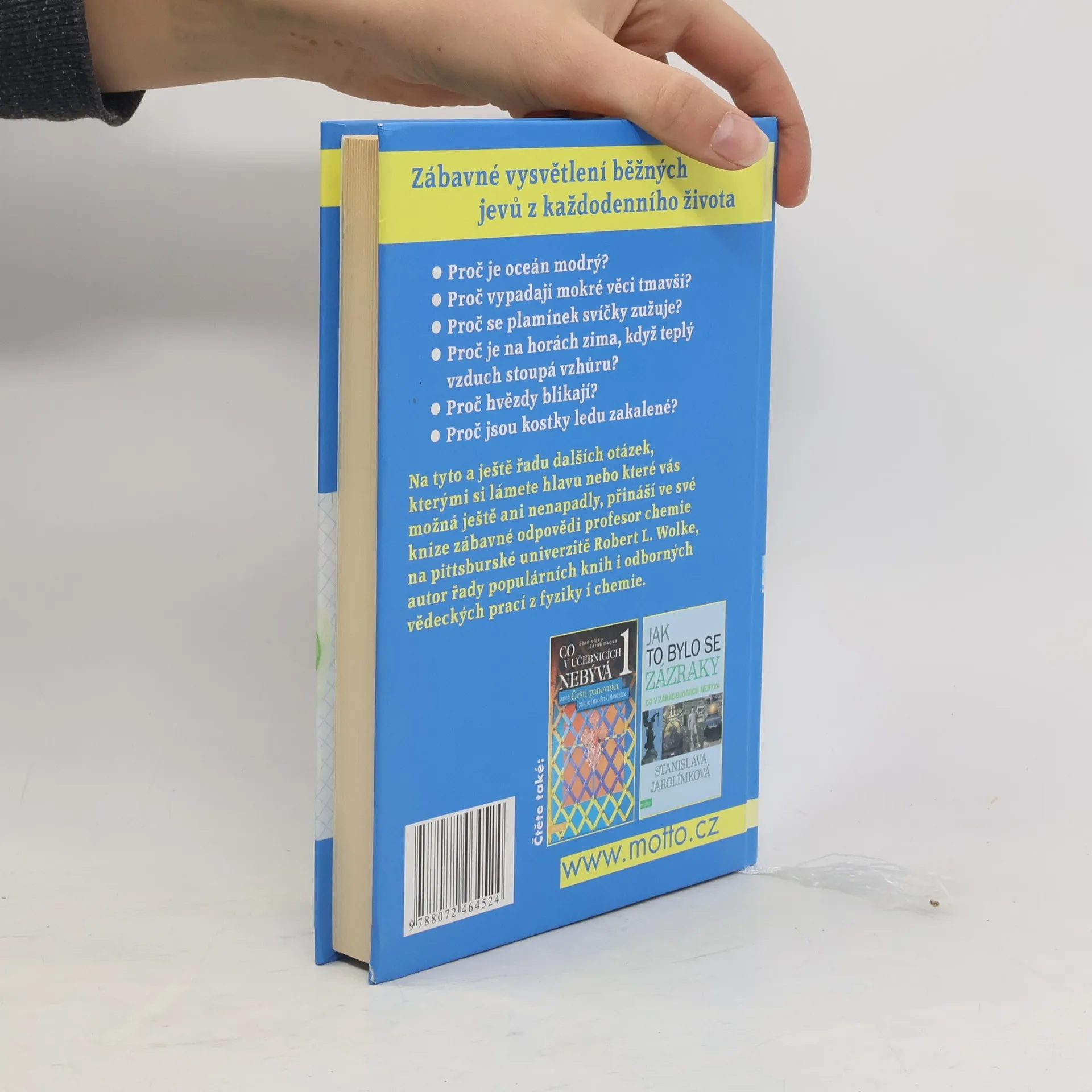 Zábavné vysvětlení běžných jevů z každodenního života. Profesor chemie na pittsburské univerzitě Robert. L. Wolke ve své úspěšné knize přináší zábavné odpovědi na řadu otázek, s kterými si dennodenně lámete hlavu, např. proč vypadají mokré věci tmavší, proč hvězdy blikají či proč se plamínek svíčky zužuje.