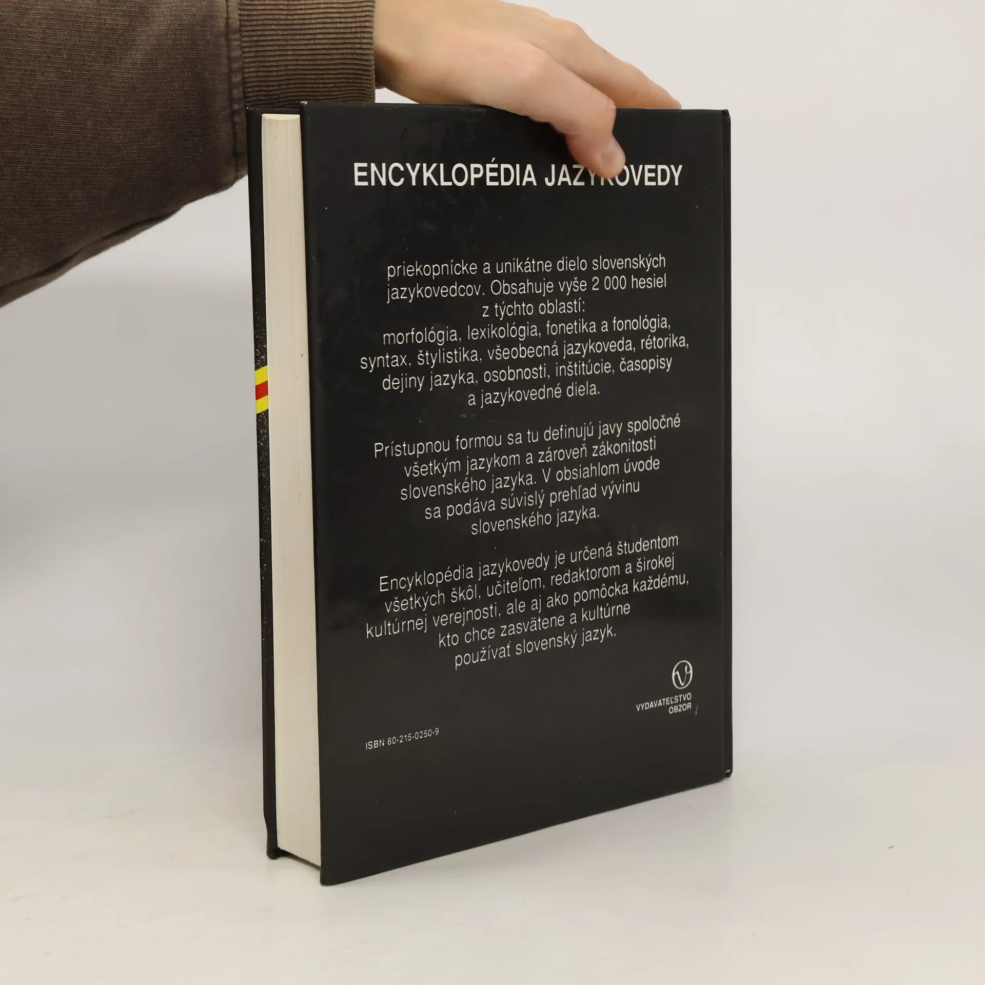 Priekopnícke a unikátne dielo slovenských jazykovedcov. Obsahuje vyše 2000 hesiel z týchto oblastí: morfológia, lexikológia, fonetika a fonológia, syntax, štylistika, všeobecná jazykoveda, rétorika, dejiny jazyka, osobnosti, inštitúcie, čaopisy a jazykovedné diela. Prístupnou formou sa tu definujú javy spoločné všetkým jazykom a zároveň zákonitosti slovenského jazyka. V obsiahlom úvode sa podáva súvislý prehľad vývinu slovenského jazyka. Encyklopédia jazykovedy je určená študentom všetkých škôl, učiteľom, redaktorom a širokej kultúrnej verejnosti, ale aj ako pomôcka každému, kto chce zasvätene a kultúrne používať slovenský jazyk.