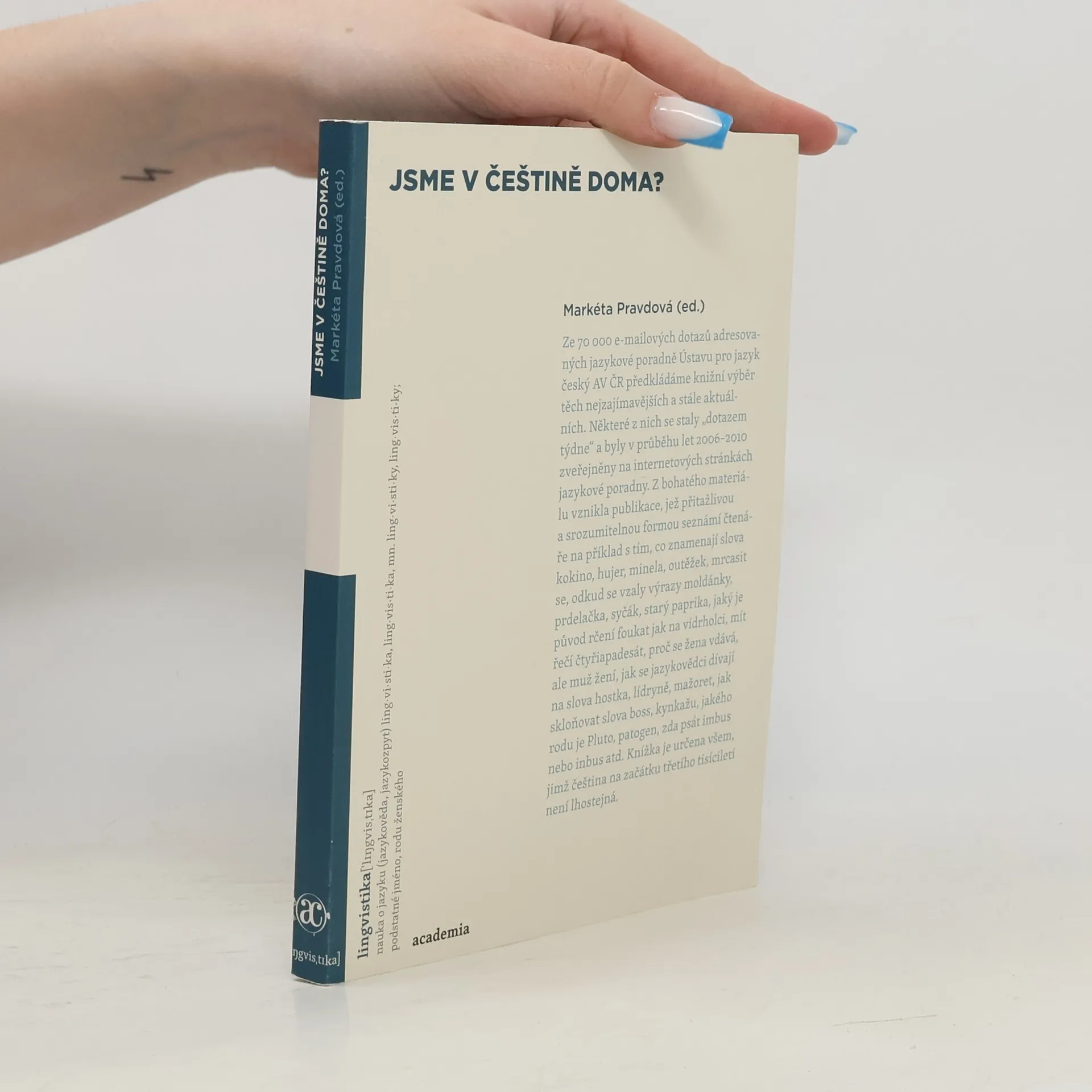 Z více než sedmdesáti tisíc dotazů zaslaných e-mailem jazykové poradně Ústavu pro jazyk český AV ČR předkládáme knižní výběr těch nejzajímavějších a stále aktuálních. Některé z nich se staly „dotazem týdne“ a byly v průběhu let 2006–2010 zveřejněny na internetových stránkách jazykové poradny. Z bohatého materiálu vznikla publikace, jež přitažlivou a srozumitelnou formou seznámí čtenáře například s tím, co znamenají slova kokino, hujer, minela, outěžek, mrcasit se, odkud se vzaly výrazy moldánky, prdelačka, syčák, starý paprika, jaký je původ rčení foukat jak na vidrholci, mít řečí čtyřiapadesát, proč se žena vdává, ale muž žení, jak se jazykovědci dívají na slova hostka, lídryně, mažoret, jak doporučují skloňovat slova boss, kynkažu, jakého rodu je Pluto, patogen, tsunami, zda psát imbus, nebo inbus atd. Knížka je určena všem, jimž čeština na začátku třetího tisíciletí není lhostejná.