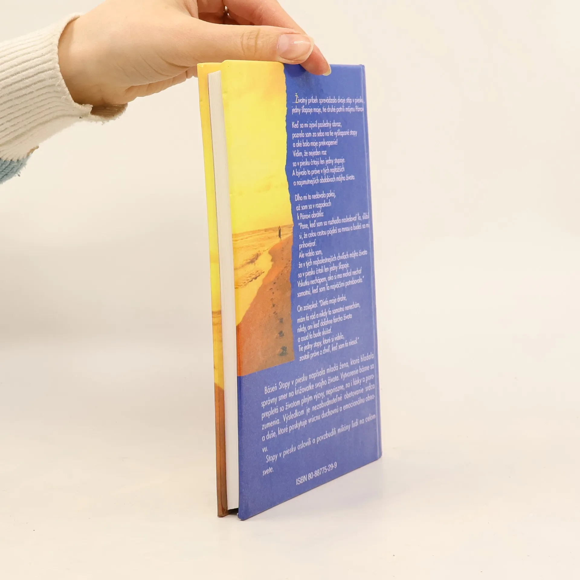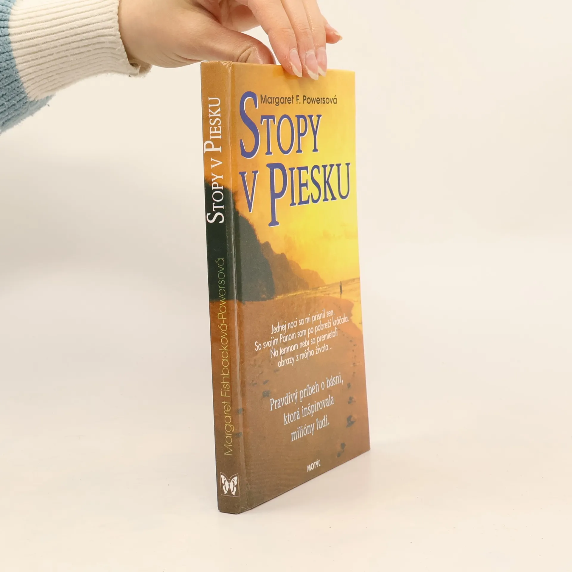 Báseň Stopy v piesku napísala mladá žena, ktorá hľadala správny smer na križovatke svojho života. Vytvorenie básne sa prepletá so životom plným výzvy, nepriazne, no i lásky a porozumenia. Výsledkom je nezabudnuteľné obetovanie srdca a duše, ktoré poskytuje vrúcnu duchovnú a emocionálnu obnovu. Stopy v piesku oslovili a povzbudili milióny ľudí na celom svete.