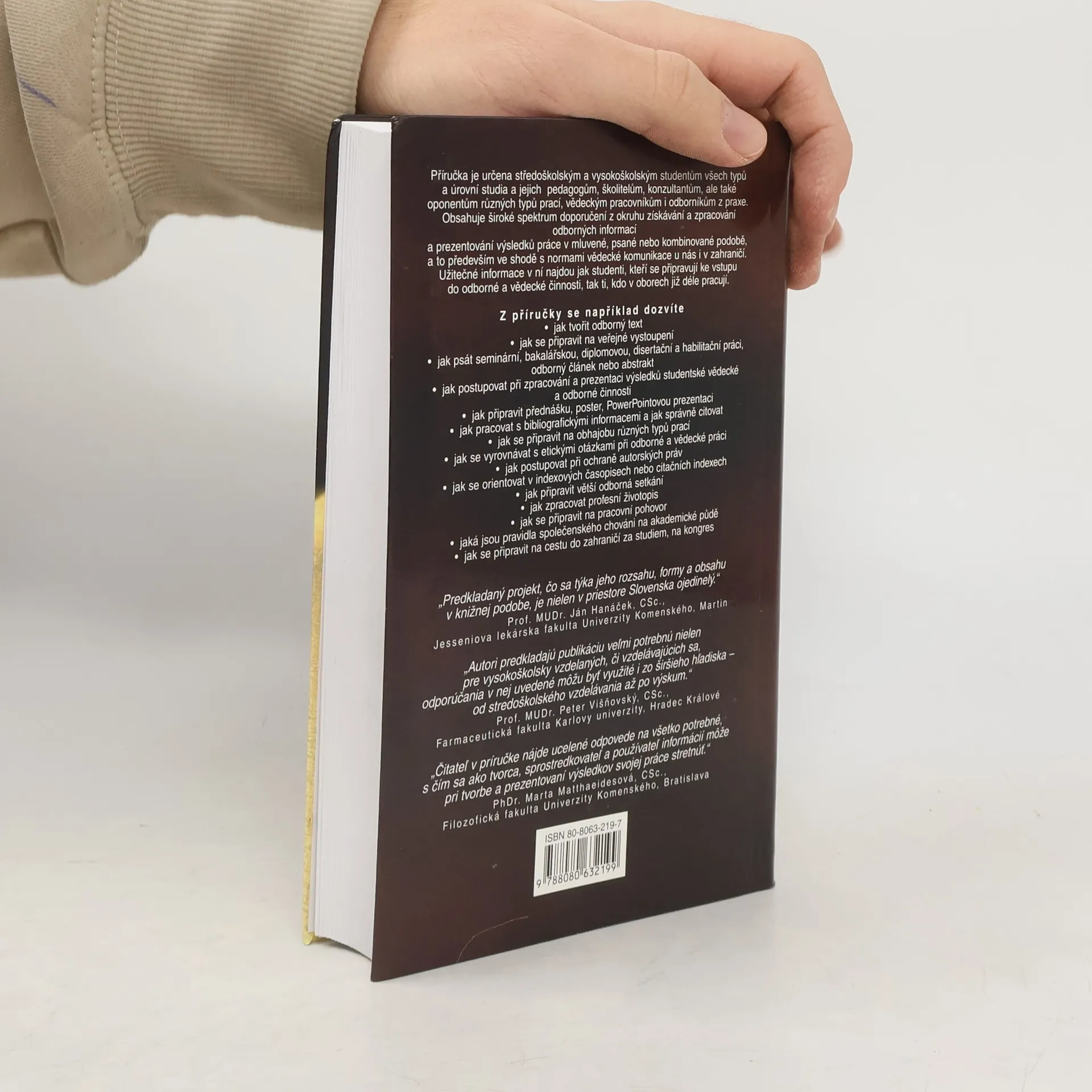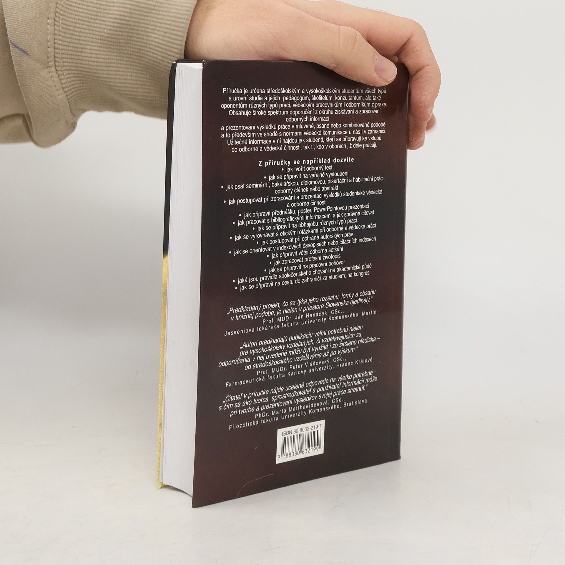 Příručka je určena středoškolským i vysokoškolským studentům všech typů a úrovní studia i jejich pedagogům, školitelům a odborníkům z praxe. Najdete v ní vše, co budete potřebovat při přípravě prezentace, organizování konference či psaní životopisu, diplomové práce či odborného článku. Naučte se akademické etiketě a principům rétoriky, které se vám budou hodit nejen při studiu, ale také v praxi.