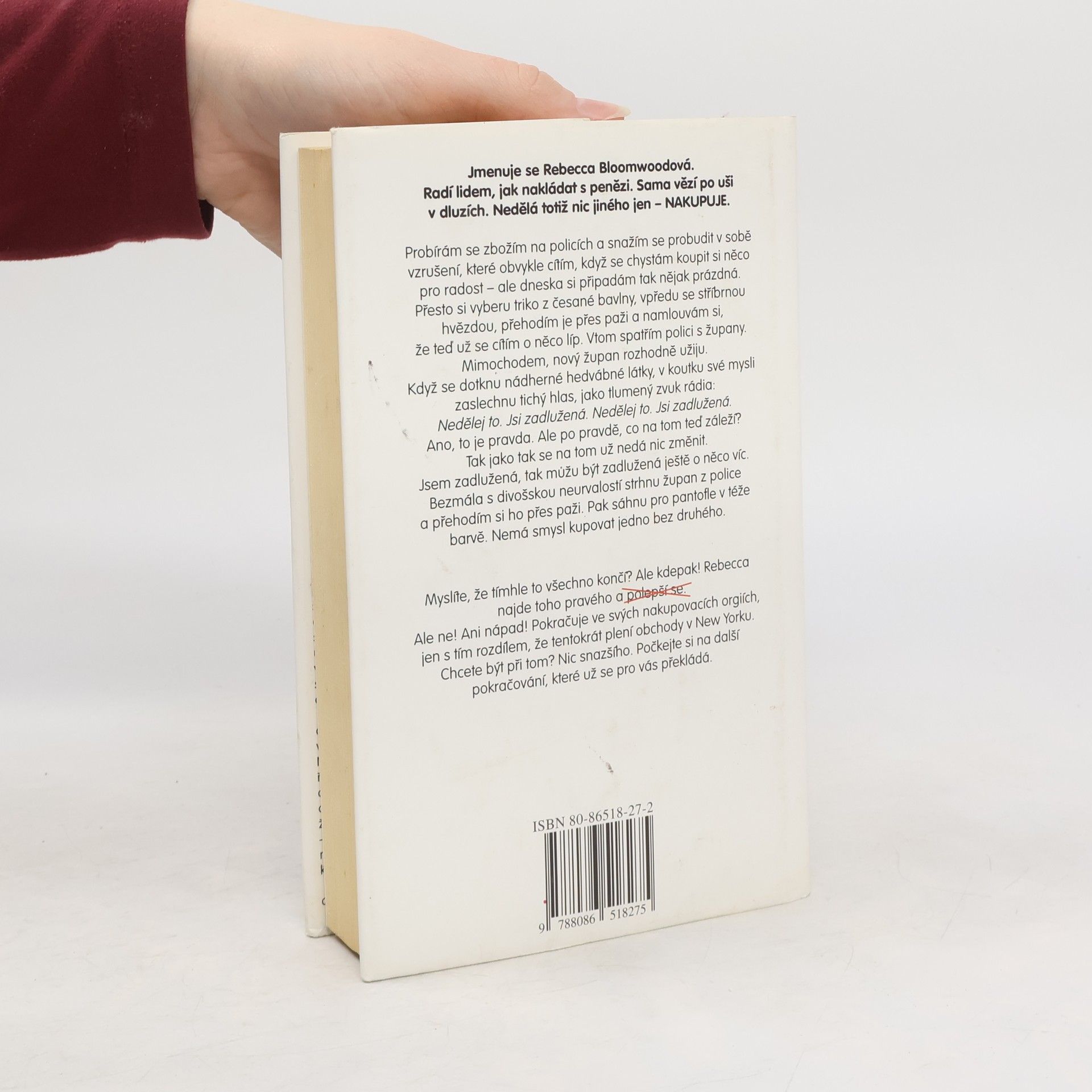 ALKOHOLIK nemůže žít bez pití, WORKOHOLIK bez práce a SHOPAHOLIK bez nákupů! Rebecca Bloomwoodová, mile praštěná hrdinka této knihy, je přímo živoucím důkazem shopaholika. Radí lidem, jak nakládat s penězi, ale sama vězí po uších v dluzích. Nedělá totiž nic jiného, než vášnivě nakupuje. Pracuje jako redaktorka v nepříliš známých novinách zaměřených - ta ironie! - na spoření, investování a vůbec rozumné nakládání s financemi. Pokud ale Rebecca něco zoufale neovládá, pak je to právě hospodaření s penězi. Nemůže sedět v kanceláři, aniž by přitom nemyslela na nákupy, nemůže jít po ulici, aby nevešla do obchodu, a nemůže do něho vstoupit, aby něco nekoupila. A protože se jí nadevše líbí pěkné věci a prahne po oblečení světových značek, není divu, že její úvěry a dluhy rostou do nebe a poštovní schránka přetéká stále výhrůžnějšími upomínkami. Začarovaný kruh lží a beznaděje, z něhož zdánlivě není úniku, se rozšiřuje. Nakonec pomůže nečekaná náhoda. Stačí jeden článek v celostátních novinách, jedno šokující pozvání do televize a jeden nepřítel, z něhož se náhle vyklube nejlepší přítel. Vlastně "přítel" možná není to nejlepší slovo Když totiž dotyčný gentleman konečně pozve Rebeku na večeři, oba zjistí, že čistě náhodou... celý text