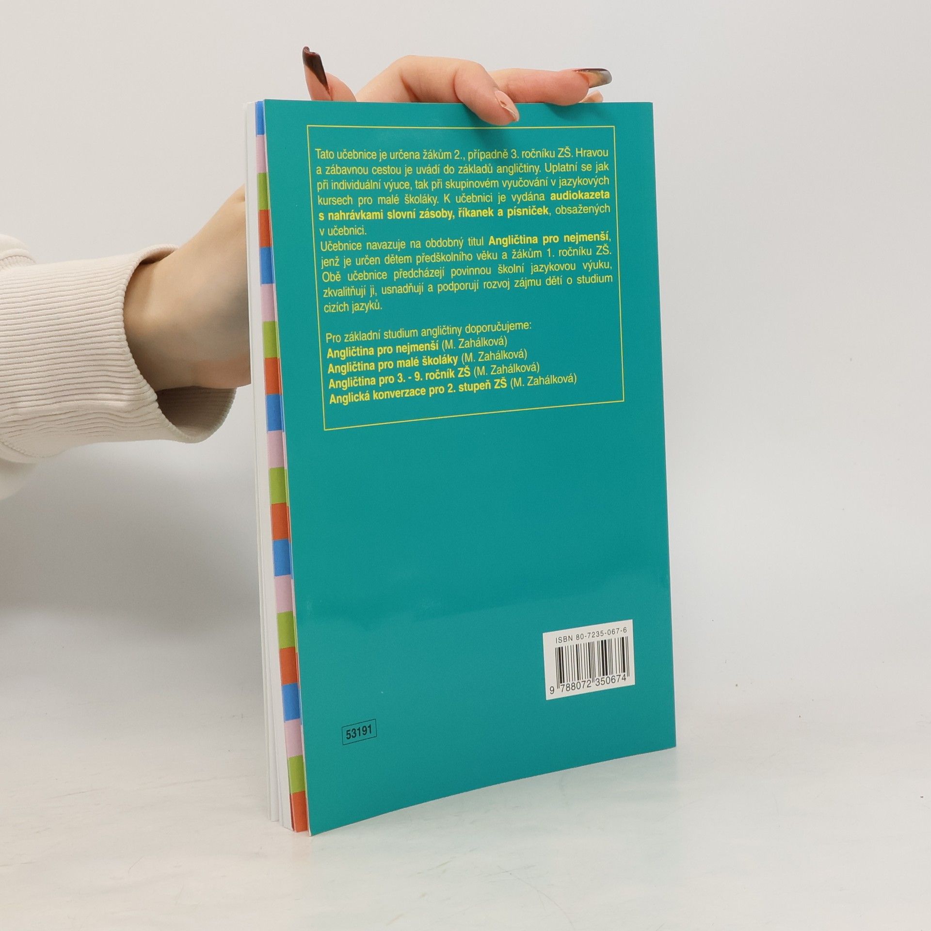 Učebnice zkušené autorky a učitelky je určena žákům 2. a 3. ročníku. Předchází povinnou jazykovou výuku od 4. ročníku. Učebnice učí slovní zásobu a základy angličtiny podle obrázků a nápodobou mluvního vzoru dospělého, využívá formu omalovánek, pexesa atd. Počítá se schopností dětí číst a psát.Učebnice v sobě zahrnují metodickou příručku pro dospělé průvodce začínajících žáků, ať už jsou jimi rodiče či učitelé v jazykových kursech a kroužcích. Učebnici provází audiokazeta připravená s rodilými anglickými mluvčími dětského věku. Obsahuje základní slovní zásobu, říkanky, básničky a písničky, které výuku jazyka zpestřují a zkvalitňují. Schvalovací doložka MŠMT ČR.