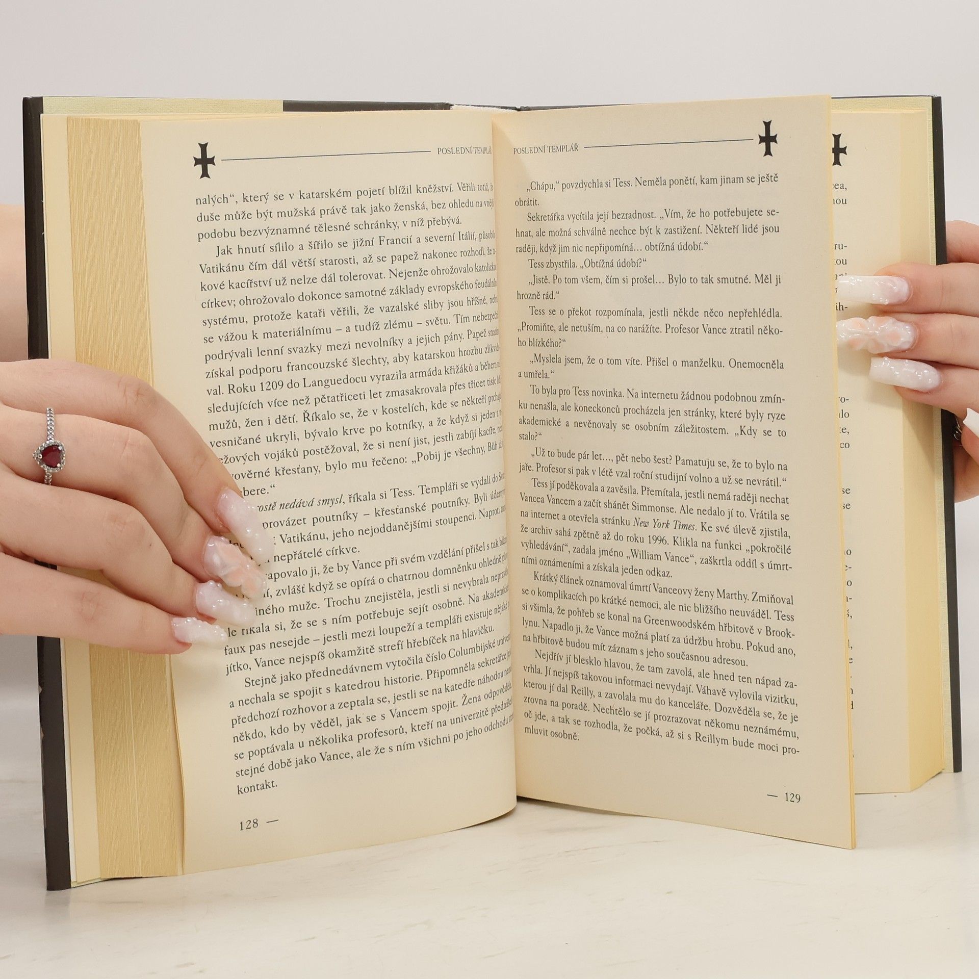 Detektivní thriller o hledání tajuplného templářského artefaktu, ukradeného při loupežném přepadení newyorského muzea. V Metropolitním muzeu v New Yorku se připravuje ojedinělá výstava - vystavovány mají být poklady ukryté po staletí za zdmi Vatikánu. Ale již při vernisáži vnikne i přes všechna bezpečnostní opatření do muzea čtveřice ozbrojených mužů, pozabíjí a zraní mnoho návštěvníků a několik cenných artefaktů ukradne. Do pátrání po zločincích se pustí nejen FBI, ale i archeoložka - očitá svědkyně krádeže, a církev, stojící za každou cenu o navrácení jednoho z odcizených předmětů. Ten by totiž mohl odhalit dlouho ukrývané tajemství zpochybňující samotné základy křesťanství. Vcelku čtivě napsaná kniha s detektivní zápletkou a konspirační teorií čerpající inspiraci z historie tajuplného templářského řádu. Chybět samozřejmě nesmí přitažlivost mezi vyšetřovatelem FBI a důvtipnou archeoložkou.