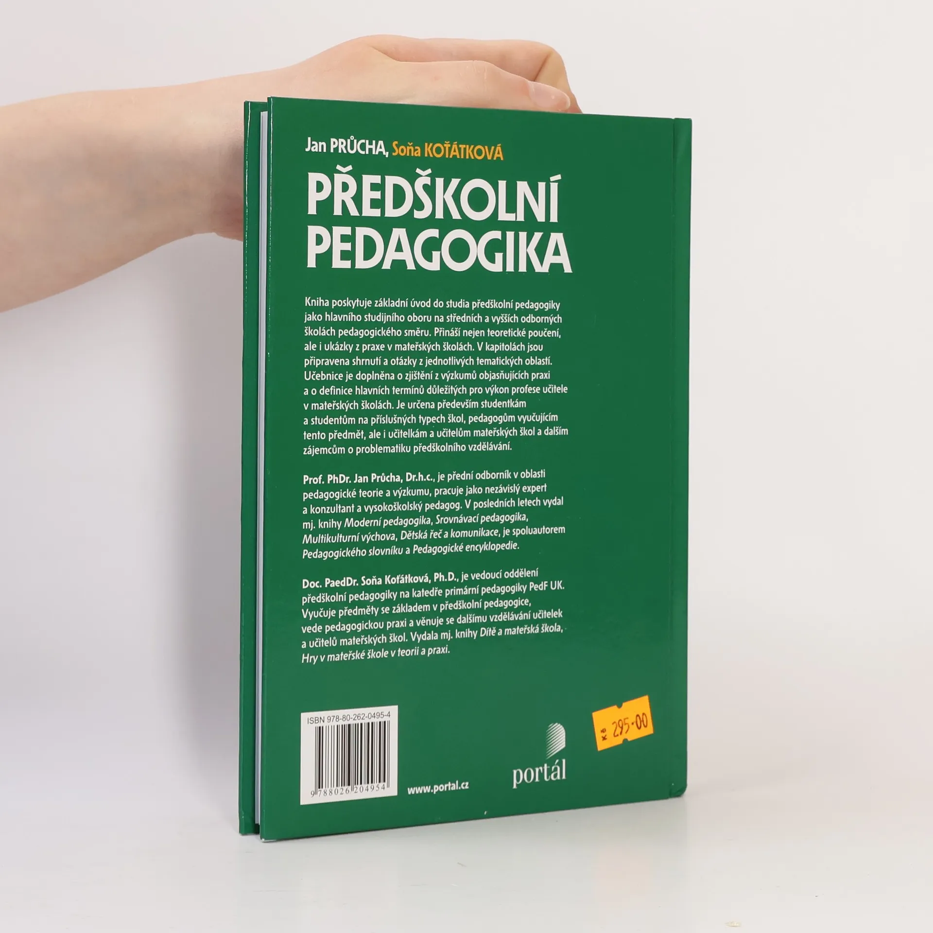 Učebnice pro střední a vyšší odborné školy / Kniha poskytuje základní úvod do studia předškolní pedagogiky jako hlavního studijního oboru na středních a vyšších odborných školách pedagogického směru. Přináší nejen teoretické poučení, ale i ukázky z praxe v mateřských školách. V kapitolách jsou připravena shrnutí a otázky z jednotlivých tematických oblastí. Učebnice je doplněna o zjištění z výzkumů objasňujících praxi a o definice hlavních termínů důležitých pro výkon profese učitele v mateřských školách. Je určena především studentkám a studentům na příslušných typech škol, pedagogům vyučujícím tento předmět, ale i učitelkám mateřských škol a dalším zájemcům o problematiku předškolního vzdělávání. Prof. PhDr. Jan Průcha, DrSc., Dr.h.c. je přední odborník v oblasti pedagogické teorie a výzkumu, pracuje jako nezávislý expert a konzultant a vysokoškolský pedagog. V posledních letech vydal mj. knihy Moderní pedagogika, Srovnávací pedagogika, Multikulturní výchova, Dětská řeč a komunikace, je spoluautorem Pedagogického slovníku a Pedagogické encyklopedie. PaedDr. Soňa Koťátková, Ph. D. je vedoucí oddělení předškolní pedagogiky na katedře primární pedagogiky PedF UK. Vyučuje předměty se základem v předškolní pedagogice, vede pedagogickou praxi a věnuje se dalšímu vzdělávání učitelek mateřských škol. Vydala mj. knihy Dítě a mateřská škola, Hry v mateřské škole v teorii a praxi.