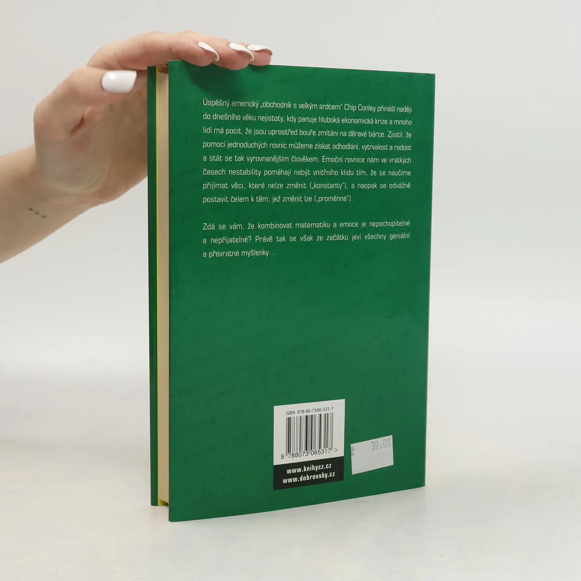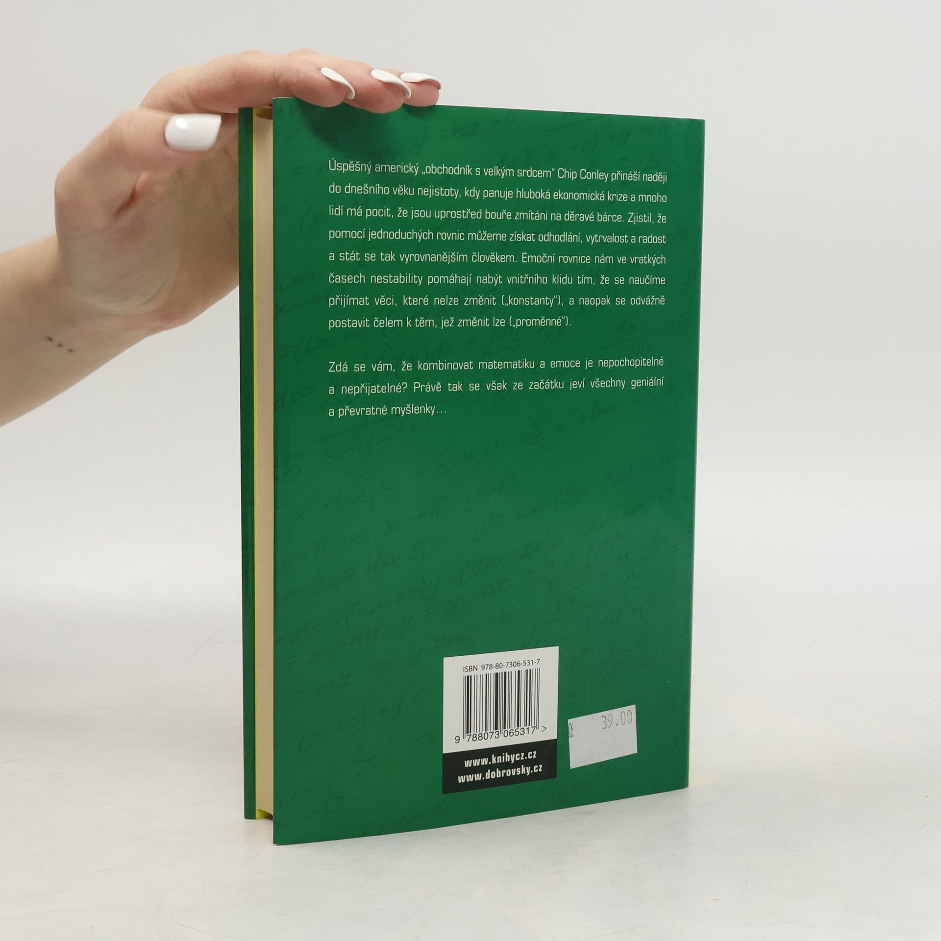 Dnes by nikdo o současném světě neřekl, že "žijeme v klidných vodách". A nedá se to říci ani o době, která přijde. V dnešním věku nejistoty, v období nejhlubší ekonomické krize za posledních 75 let, má mnoho lidí pocit, že jsou uprostřed silné bouře zmítáni na malé loďce. Úspěšný obchodník Chip Conley však zjistil, že pomocí jednoduchých slovních rovnic můžeme získat odhodlání, vytrvalost a radost a stát se tak lepším a vysoce výkonným člověkem. Emocionální rovnice vám přinášejí jednoduchý, ale velmi účinný způsob, jak nejlépe využít svých emocí. Radost=Láska-Strach Inovace= Kreativita - Konformita Mohlo by se zdát, že kombinovat matematiku a emoce je proti našemu intuitivnímu chování, to však ty nejlepší myšlenky často bývají. Conleyho Emocionální rovnice fungují jako mantry, které nám v časech nejistoty pomáhají získat stabilitu, které nám pomáhají zaměřit se na věci, které můžeme změnit ("proměnné") a vše ostatní ("konstanty") ponechat stranou.