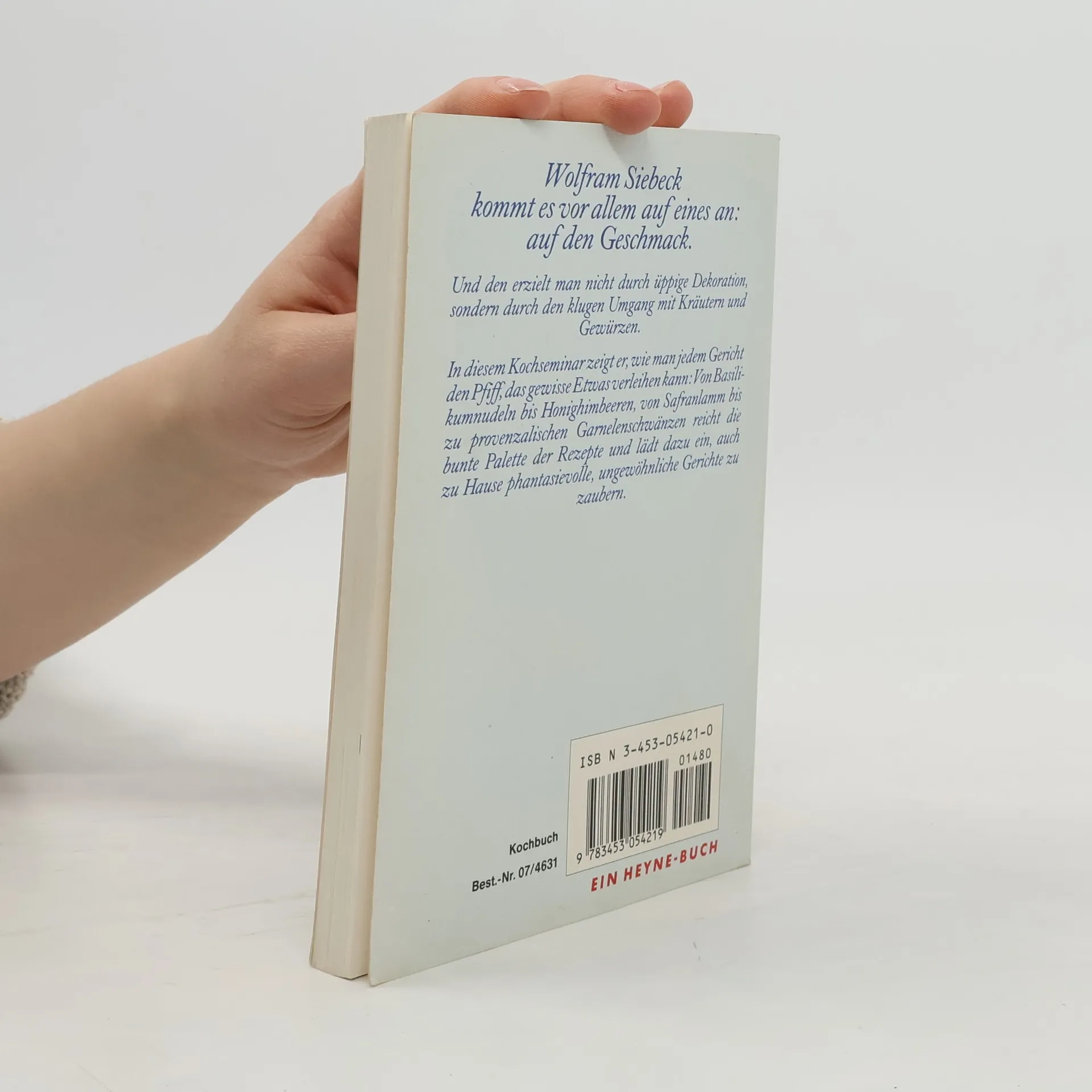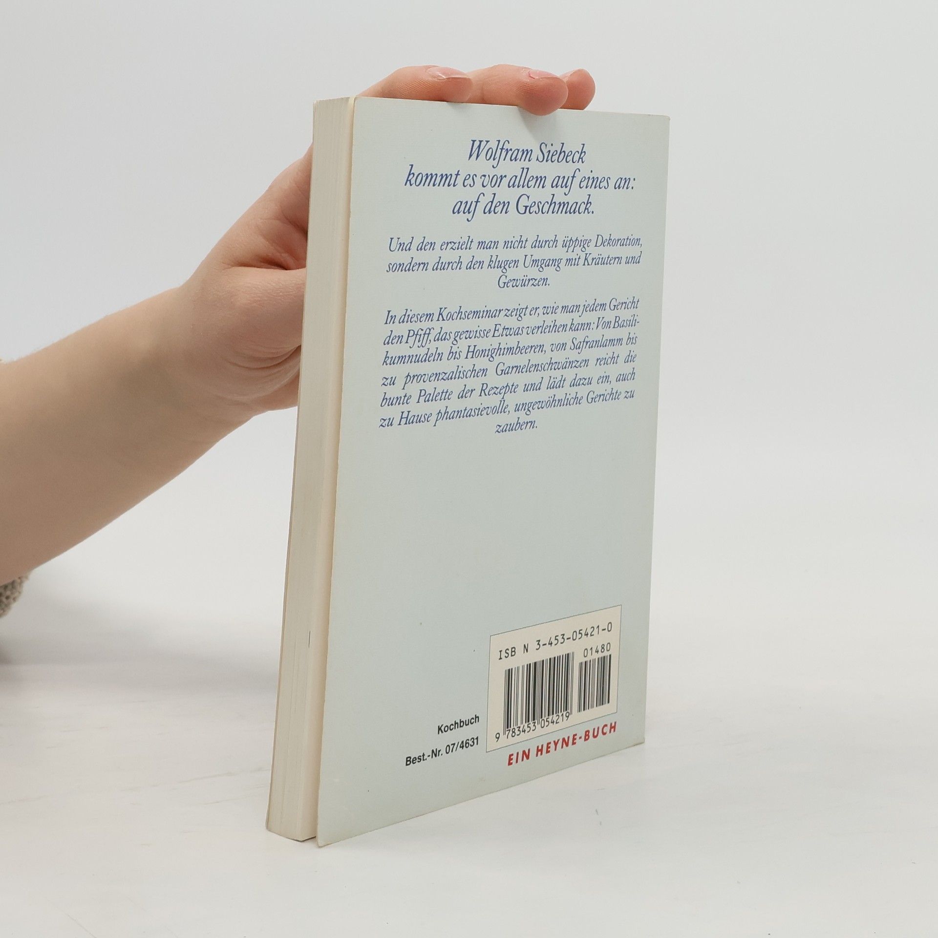 Wolfram Siebeck kommt es vor allem auf eines auf den Geschmack.Und den erziehlt man nicht durch üppige Dekoration, sondern durch den klugen Umgang mit Kräutern und Gewürzen.In diesem Kochseminar zeigt er, wie man jedem Gericht den Pfiff, das gewisse Etwas verleihen Von Basilikumnudeln bis Honighimbeeren, von Safranlamm bis zu provenzalischen Garnelenschwänzen reicht die bunte Palette der Rezepte und lädt dazu ein, auch zu Hause phantasievolle, ungewöhnliche Gerichte zu zaubern.