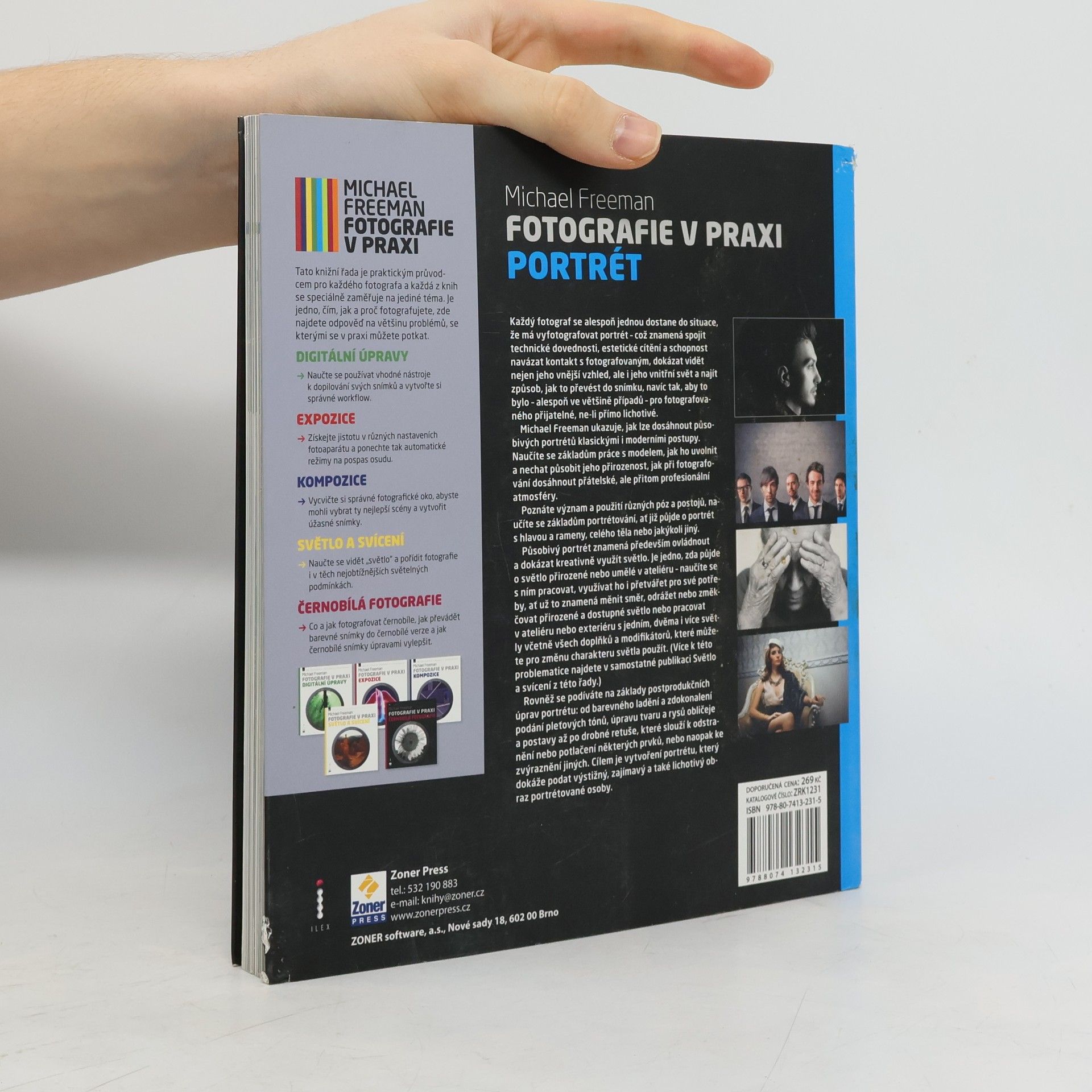 Každý někdy někoho vyfotografoval. Naučte se, jak fotografovat portréty tak, aby byli spokojeni jak fotograf, tak fotografovaný. Publikace shrnuje klíčové informace pro začínající portrétní fotografy a pro ty, kteří fotografují příležitostně. Kniha představuje základní pózy a rady pro práci s modelem, aby výsledné snímky nejen zobrazovaly, ale i charakterizovaly fotografované osoby a byly lichotivé. Naučíte se efektivně pracovat s přirozeným světlem a využívat jednoduché pomůcky, jako jsou odrazné desky nebo difuzéry. Autor vysvětluje, jak pracovat s umělým světlem a ukazuje základní techniky osvětlení portrétů. Závěr knihy se zaměřuje na úpravy portrétů na počítači, včetně vyladění pleťových barev a odstranění rušivých prvků. Ediční řada je určena zájemcům o digitální fotografii, ale je užitečná i pro fotografy s klasickými filmovými fotoaparáty. Každá publikace se soustředí na konkrétní oblast fotografování a zahrnuje cvičení pro čtenáře, včetně ukázek od studentů autorových kurzů, doplněných o hodnocení a poznámky autora.