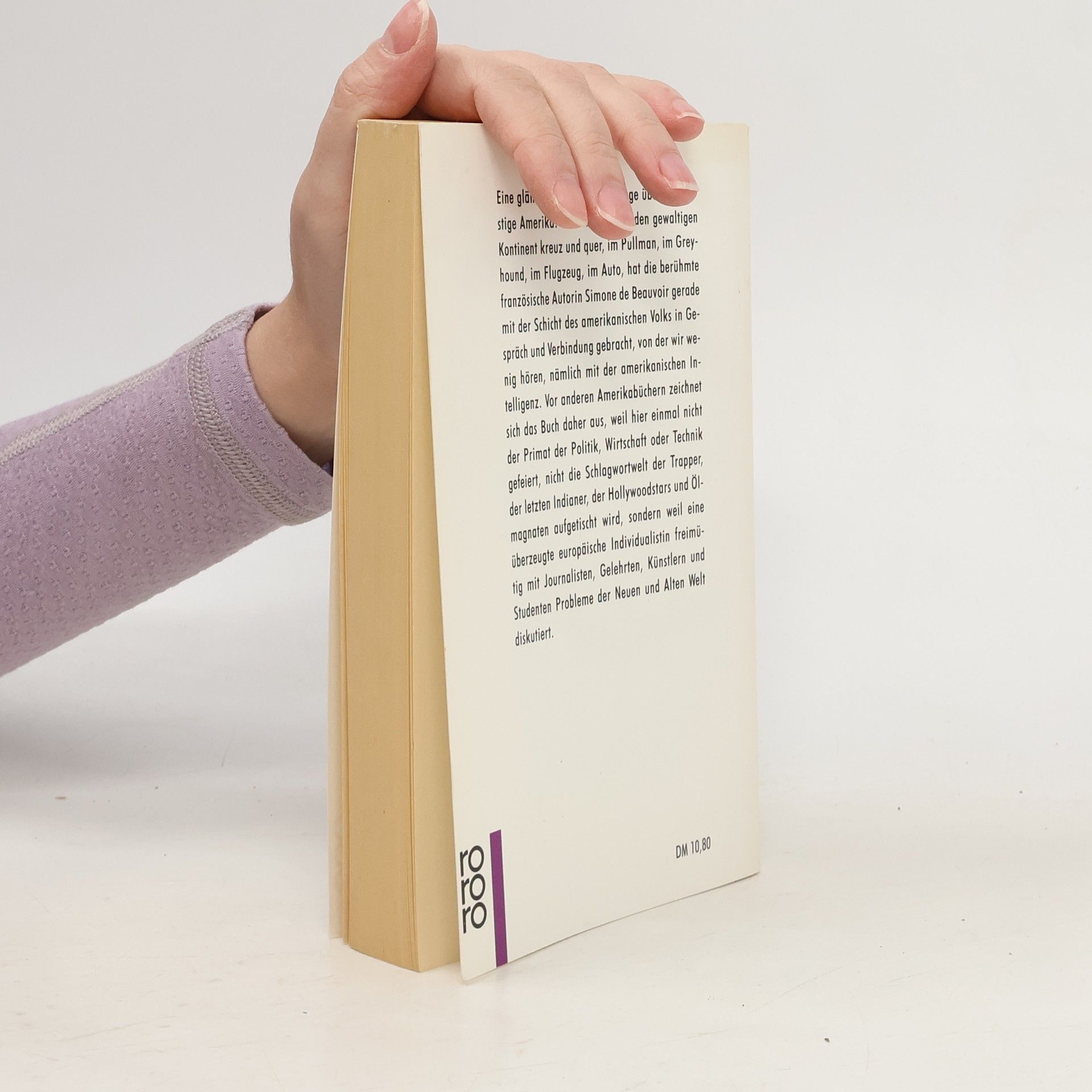 Eine glänzende, intime Reportage über das geistige Amerika. Eine Reise durch den gewaltigen Kontinent, kreuz und quer, im Pullman, im Greyhound, im Flugzeug, im Auto, hat die berühmte französische Autorin Simone de Beauvoir gerade mit der Schicht des amerikanischen Volks in Gespräch und Verbindung gebracht, von der wir wenig hören, nämlich der amerikanischen Intelligenz. Vor anderen Amerikabüchern zeichnet sich das Buch daher aus, weil hier einmal nicht der Primat der Politik, Wirtschaft oder Technik gefeiert, nicht die Schlagwortwelt der Trapper, der letzten Indianer, der Hollywoodstars und Ölmagnaten aufgetischt wird, sondern weil eine überzeugte europäische Individualistin freimütig mit Journalisten, Gelehrten, Künstlern und Studenten Probleme der Neuen und Alten Welt diskutiert.