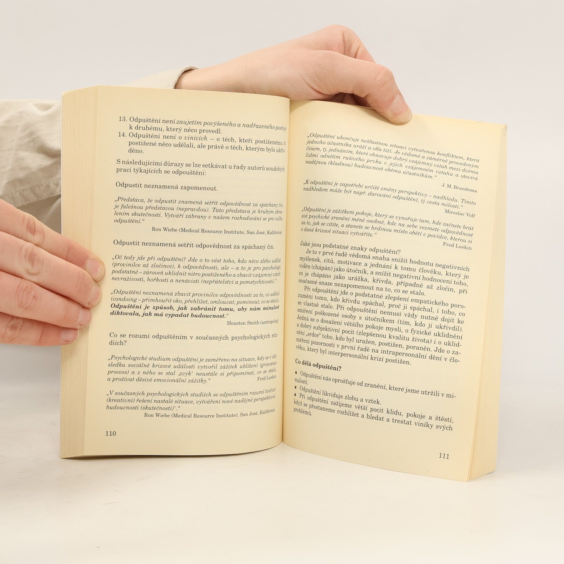 Jedním z nejvýznamnějších trendů současné psychologie je posun ke studiu pozitivních aspektů lidského života. Tento proud současné psychologie je označován jako "pozitivní psychologie". Přestože budí mimořádný zájem odborníků, v češtině dosud o tomto tématu neexistuje knižní publikace. Náš přední odborník podává přehled tematiky studované v rámci tohoto směru se zaměřením na procesy odpouštění a smiřování, jež mají zásadní význam pro porozumění mezilidským vztahům a jejich zlepšování. Pozornost je rovněž věnována práci s negativními emocemi, ale i optimismu, radosti a naději a jejich souvislosti s duševním a tělesným zdravím a dalším tématům.