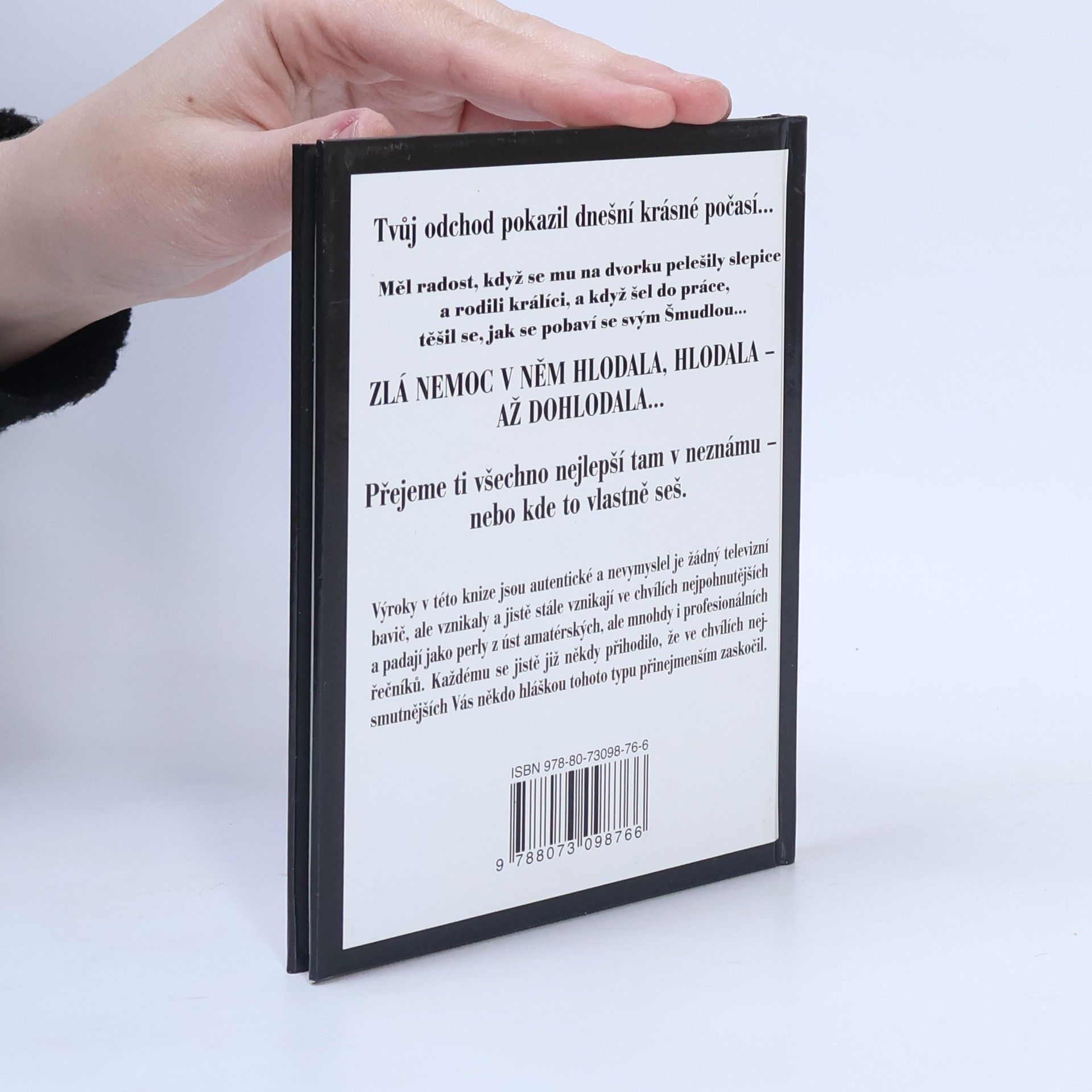 "Průpovídky ze hřbitovů a krematorií". Výroky v této knize (''Tvůj odchod pokazil dnešní krásné počasí...'', ''Zlá nemoc v něm hlodala, hlodala - až dohlodala...'', ''Znal cenu funkce, kterou vykonával'') jsou autentické a nevymyslel je žádný televizní bavič, ale vznikaly a jistě stále vznikají ve chvílích nejpohnutějších a padají jako perly z úst amaterských, ale mnohdy i profesionálních řečníků. Každému se jistě již někdy přihodilo, že ve chvílích nejsmutnějších Vás někdo hláškou tohoto typu přinejmenším zaskočil.