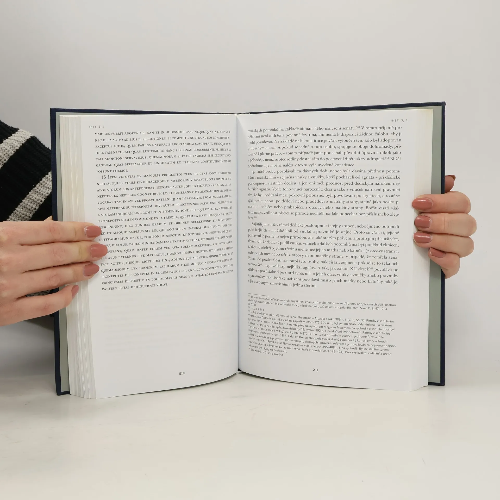 Překlad učebnice práva východořímského císaře Iustiniana z počátku 6. století n. l. se zaměřuje na římské soukromé právo a zahrnuje také trestní právo a obecné právní principy. Tato učebnice, používaná až do 18. století, představuje myšlenkový odkaz římské právní vědy, který ovlivnil generace právníků, soudců a zákonodárců. Poskytuje studentům právnických fakult první kontakt s právem, přičemž systematika římského právního řádu umožňuje proniknout do právní vědy a osvojit si právnické myšlení. Informace o římském právu pocházejí z různých pramenů, včetně zákoníků a odborných spisů římských právníků, ale také epigrafických, papyrologických a numismatických artefaktů. Úplné a bezmezerové studium římskoprávních textů je vzácné, avšak Institutiones seu Elementa, jak zní plný název této učebnice, představují výjimku. Překlad umožňuje čtenářům, stejně jako studentům antiky, seznamovat se s oblastmi římského soukromého práva a obdivovat provázanost jeho institutů. Instituce byly zamýšleny jako učebnice a obsahují údaje vztahující se k předchozím dobám, což je činí také průvodcem po životě antického Říma a autentickým obrazem každodenního života jeho obyvatel.
