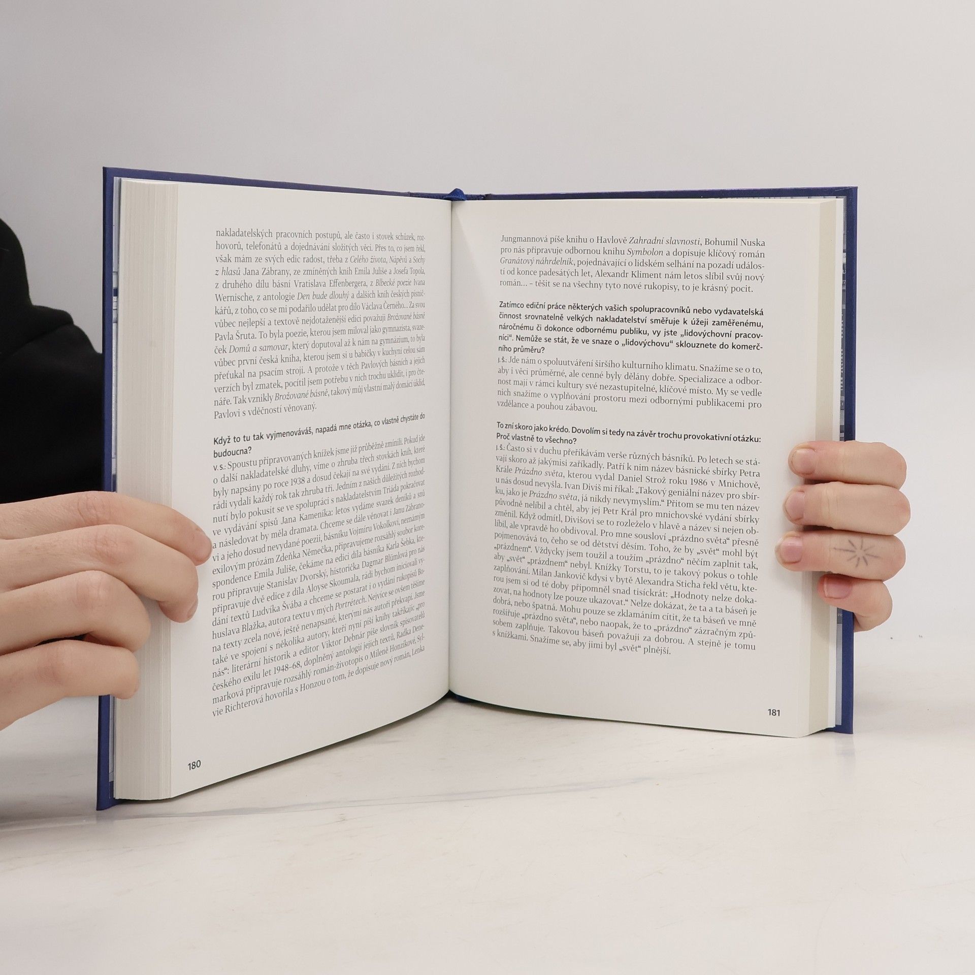 500. publikace nakladatelství Torst přináší obsáhlý rozhovor Josefa Chuchmy s nakladatelem Viktorem Stoilovem a stálým spolupracovníkem nakladatelství, redaktorem a editorem Janem Šulcem, kteří ve svém vyprávění zaznamenávají detaily z redakční, ediční a nakladatelské práce v letech 1990-2010 a hovoří o mnoha českých spisovatelích, fotografech, výtvarnících, editorech, redaktorech a dalších osobnostech kulturního a veřejného života. Součástí knihy je úplná bibliografie 499 vydaných knih nakladatelství Torst, opatřená podrobnými tematickými rejstříky, kterou sestavila Adéla Petruželková. Kniha přináší též barevné reprodukce obálek všech vydaných knih a příležitostných publikací, reprodukce více než 80 obálek překladů knih nakladatelství Torst do cizích jazyků a přes 200 unikátních fotografií, faksimilí a dokumentů.