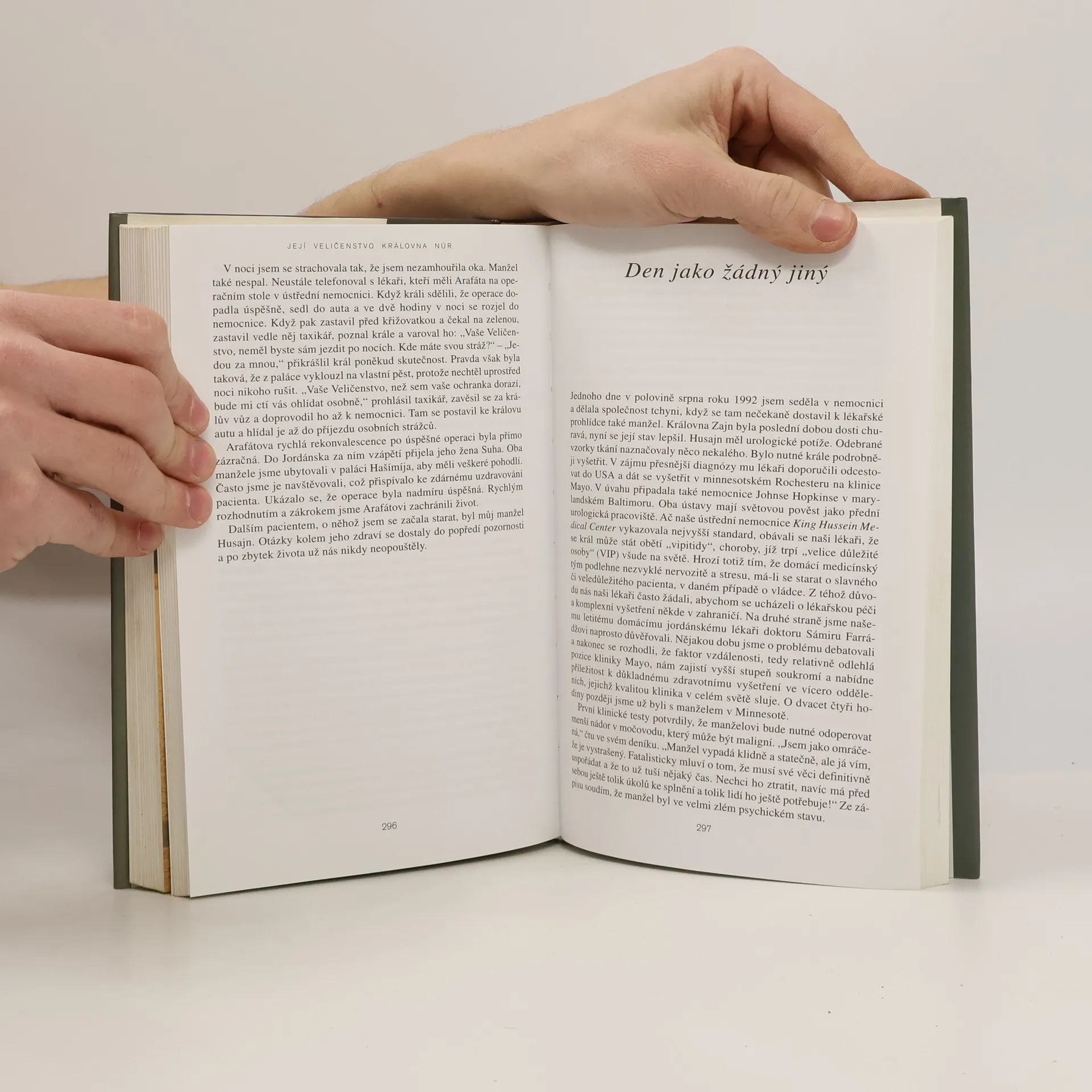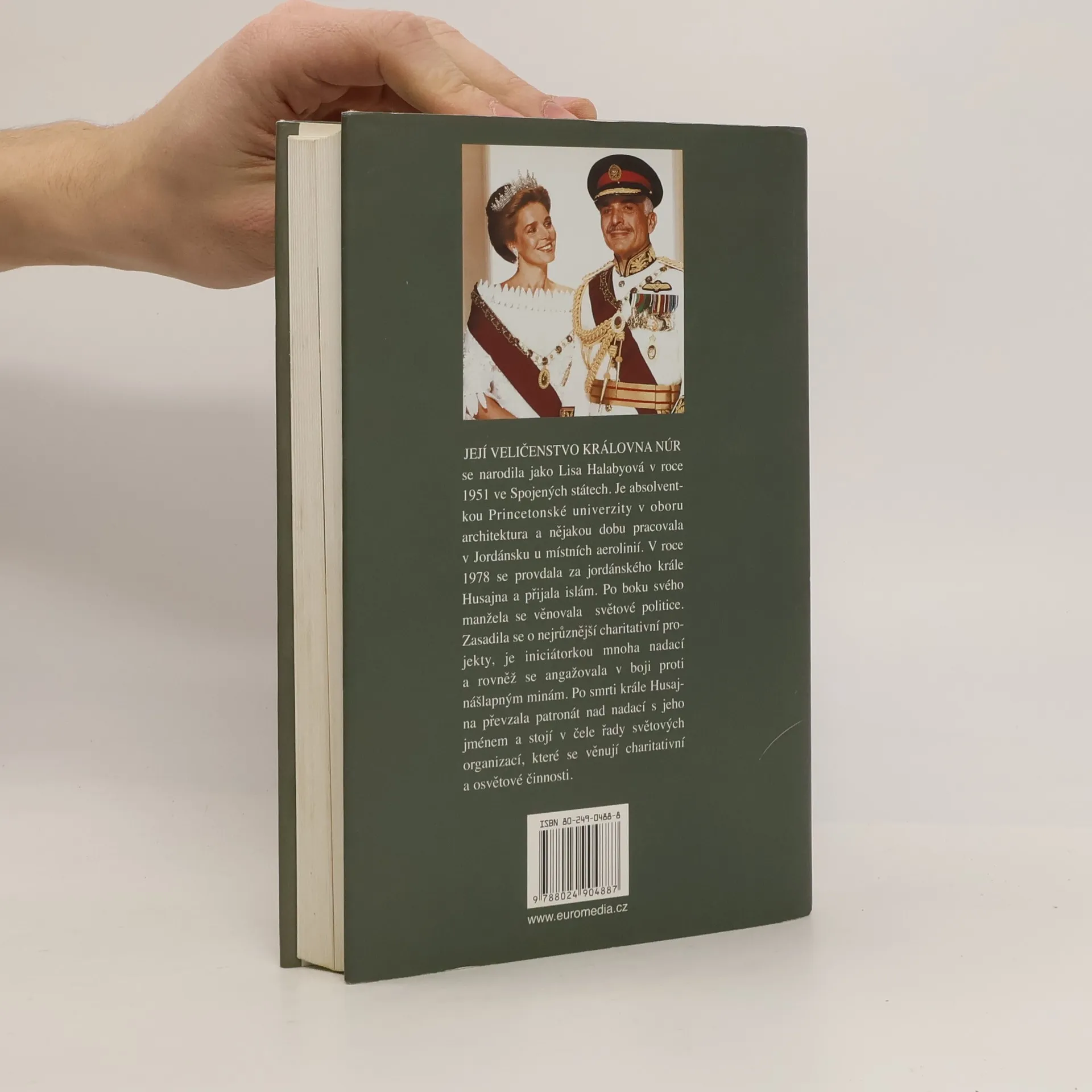Její Veličenstvo královna Núr se narodila v r. 1951 v USA jako Lisa Halabyová. Je absolventkou Princetonské univerzity, nějakou dobu pracovala v Jordánsku u místních aerolinií.Tam se seznámila s jordánským králem Husajnem; setkání vedlo k téměř románovému vyústění: neznámá emancipovaná Američanka se v r. 1978 stala jordánskou královnou Núr al-Husajní a postupně matkou jeho čtyř dětí. Po boku manžela se věnovala světové politice, zasadila se za charitativní projekty, angažovala se v boji proti nášlapným minám. Po smrti krále převzala patronát nad nadací s jeho jménem a stojí v čele řady světových charitativních organizací. Ve svých pamětech se smyslem pro humor popisuje, jak musela překážky, které před ni kladlo nové společenské postavení. Její memoáry dávají nahlédnout do střeženého soukromí královské rodiny a přinášejí jedinečný portrét tohoto monarchy. Zároveň ukazují mentalitu arabského světa a dokumentují, jak stále víc narůstá neporozumění mezi USA a arabským světem.