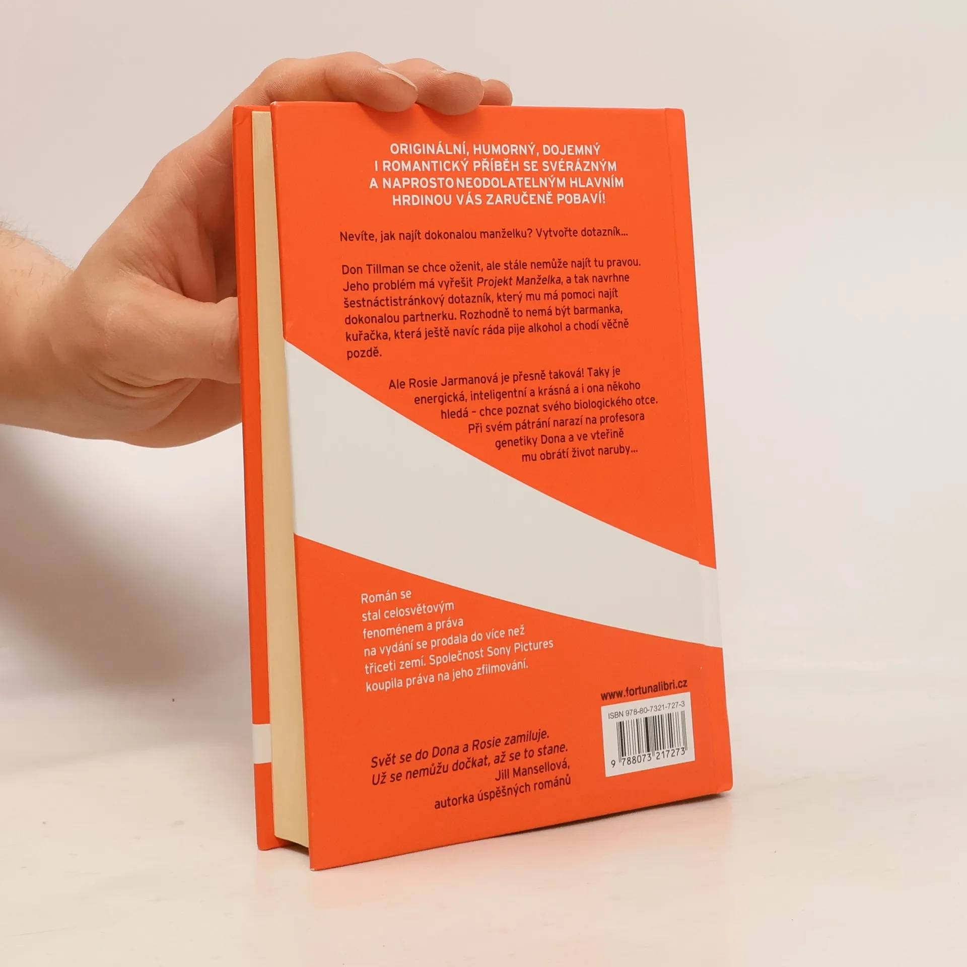 Originální, humorný, dojemný i romantický příběh se svérázným a naprosto neodolatelným hlavním hrdinou vás zaručeně pobaví! Nevíte, jak najít dokonalou manželku? Vytvořte dotazník... Don Tillman se chce oženit, ale stále nemůže najít tu pravou. Jeho problém má vyřešit Projekt Manželka, a tak navrhne šestnáctistránkový dotazník, který mu má pomoci najít dokonalou partnerku. Rozhodně to nemá být barmanka, kuřačka, která ještě navíc ráda pije alkohol a chodí věčně pozdě. Ale Rosie Jarmanová je přesně taková! Taky je energická, inteligentní a krásná a i ona někoho hledá – chce poznat svého biologického otce. Při svém pátrání narazí na profesora genetiky Dona a ve vteřině mu obrátí život naruby... Román se stal celosvětovým fenoménem a práva na vydání se prodala do více než třiceti zemí. Společnost Sony Pictures koupila práva na jeho zfilmování.