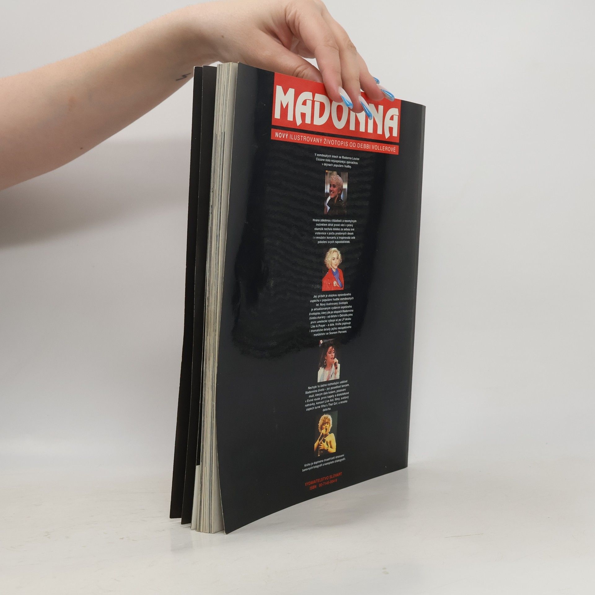 Nový ilustrovaný životopis od Debbi Vollerové. V 80. letech se Madonna Louise Ciccone stala nejúspěšnější zpěvačkou v dějinách populární hudby. Hnána zděděnou ctižádostí a neomylným instinktem dělat pravé věci v pravý okamžik nechala daleko za sebou své vrstevnice v počtu prodaných desek i v množství koncertů a inspirovala celé pokolení svých napodobitelek. Její příběh je ukázkou opravdového úspěchu v populární hudbě 80. let. Nový ilustrovaný životopis je aktualizovaným vydáním úspěšného životopisu, který jde po stopách Madonnina života a kariéry - od dětství v Detroitu přes první umělecké výboje až po LP desku Like a Prayer - a dále. Kniha popisuje i dramatické detaily jejího neúspěšného manželství se Seanem Pennem. Nechybí tu žádná rozhodující událost Madonnina života - její posedlost tancem, muži, kterým dala košem, pózování v Evině rouše, první kapely a diskotékové nahrávky, koncert Live Aid, filmy, světový úspěch turné Who's That Girl, a mnoho dalšího. Kniha je doplněna dvaatřiceti stranami barevných fotografií a kompletní diskografií. - anotace z přebalu knihy