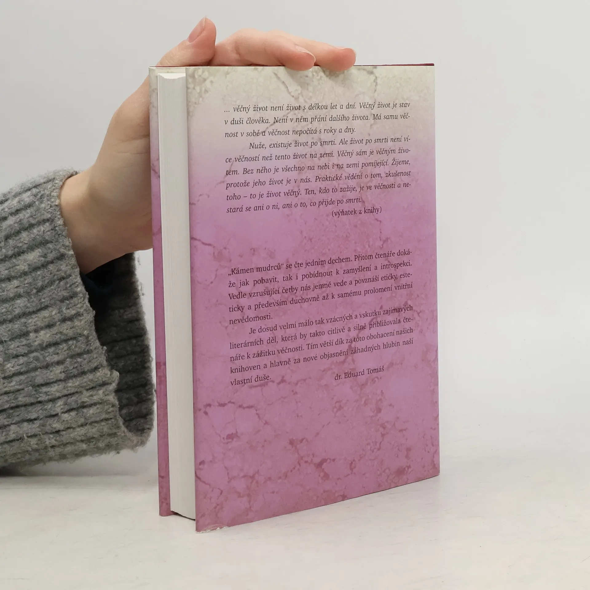 Věhlasný duchovní román dánského mystika a dramatika, oceněný jako nejlepší skandinávský román roku, vyniká brilantním literárním zpracováním a hlubokým poznáním. V roce 1923 vyhlásilo dánsko-norské nakladatelství Gyldendal soutěž o nejlepší dosud nepublikovaný skandinávský román. Anker Larsen měl rukopis, který nosil v sobě léta, ale nevěřil, že by o něj měl zájem nějaký nakladatel. Po dlouhém váhání poslal kopii, ale později se rozhodl ji stáhnout, domnívaje se, že nemá šanci na úspěch. Osud však zasáhl, když herec, který měl hrát hlavní roli v nové hře, onemocněl. Larsen se nabídl jako náhrada a zapomněl svůj rukopis stáhnout. Když se o několik dní později vrátil do nakladatelství, bylo už pozdě. O půl roku později porota složená z literárních osobností jednomyslně udělila první cenu neznámému autorovi „Kamene mudrců“. Kniha vyšla v nákladu 20 000 exemplářů a byla rychle rozebrána, čímž se Larsen stal světoznámým. Někteří kritici však zůstali rezervovaní, nepochopili, že pro autora byla zkušenost věčnosti stejně skutečná jako hmatatelný svět. Dílo Ankera Larsena je nadčasové a stále nachází široký okruh příznivců po celém světě.