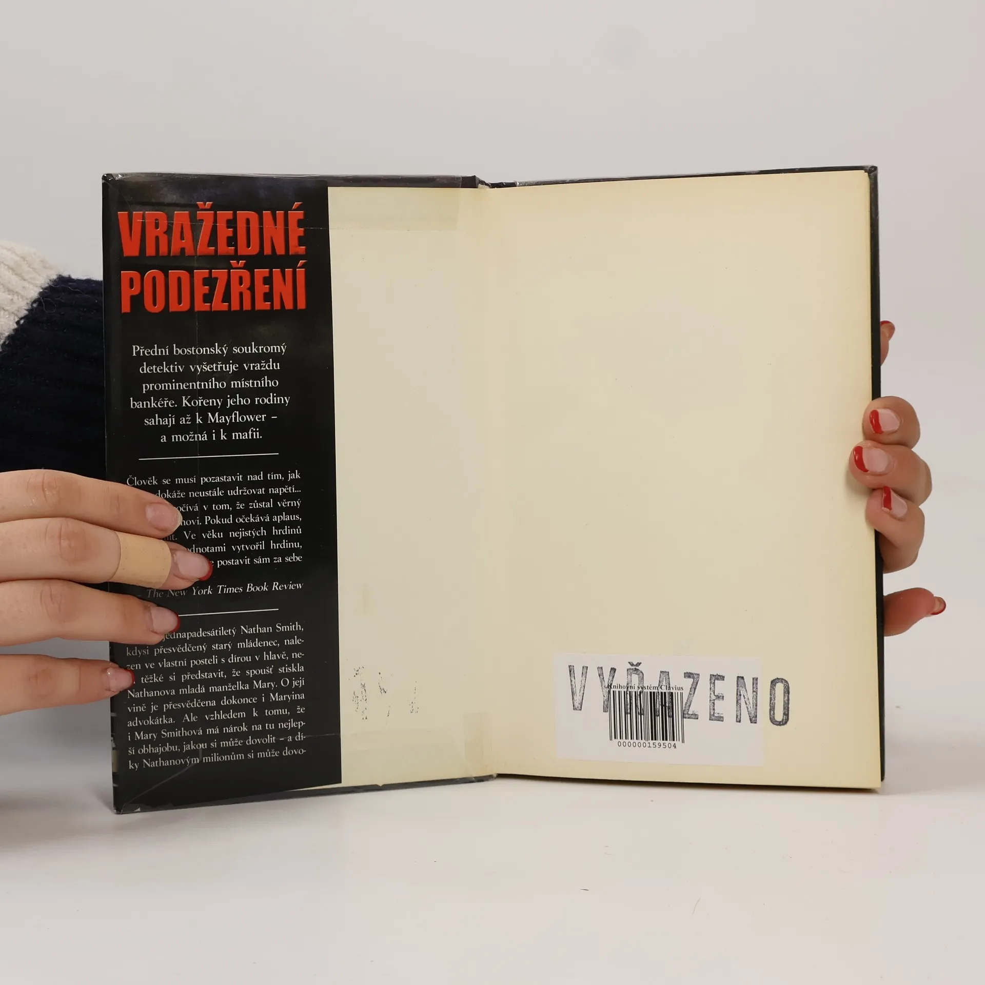 Když je jednapadesátiletý Nathan Smith, kdysi přesvědčený starý mládenec, nalezen ve vlastní posteli s dírou v hlavě, není těžké si představit, že spoušť stiskla Nathanova mladá manželka Mary. O její vině je přesvědčena dokonce i Maryina advokátka. Ale vzhledem k tomu, že i Mary Smithová má nárok na tu nejlepší obhajobu, jakou si může dovolit – a díky Nathanovým milionům si může dovolit hodně – je povolán Spenser, aby se pokusil zjistit, zda Mary nelze od nařčení očistit. Mary má poměrně mizerné alibi: tvrdí, že v době vraždy sledovala televizi v jiné místnosti. Manželé se však předchozí večer pohádali na významném koktejlovém večírku a obžaloba má svědka, který tvrdí, že se ho Mary kdysi pokusila najmout, aby Nathana zavraždil. A co víc, Mary je příliš hezká, příliš nalíčená, příliš světlovlasá a spí s kdekým – přesně ten typ, který porota obvykle nemůže vystát. Spenser se ocitá v koutě; stopy nevedou nikam, nikdo nic neví. Avšak pak je mladá žena, kterou nedávno vyhodili z funkce ve Smithově bance, nalezena mrtvá. Dosud nevinná minulost Mary najednou začíná vypadat temněji a nebezpečněji – a Spenser si musí začít hlídat záda. Vražedné podezření se svým jasným, splavným dialogem, bohatým na akci a plným ostře vyhraněných charakterů, je dalším Parkerovým triumfem.