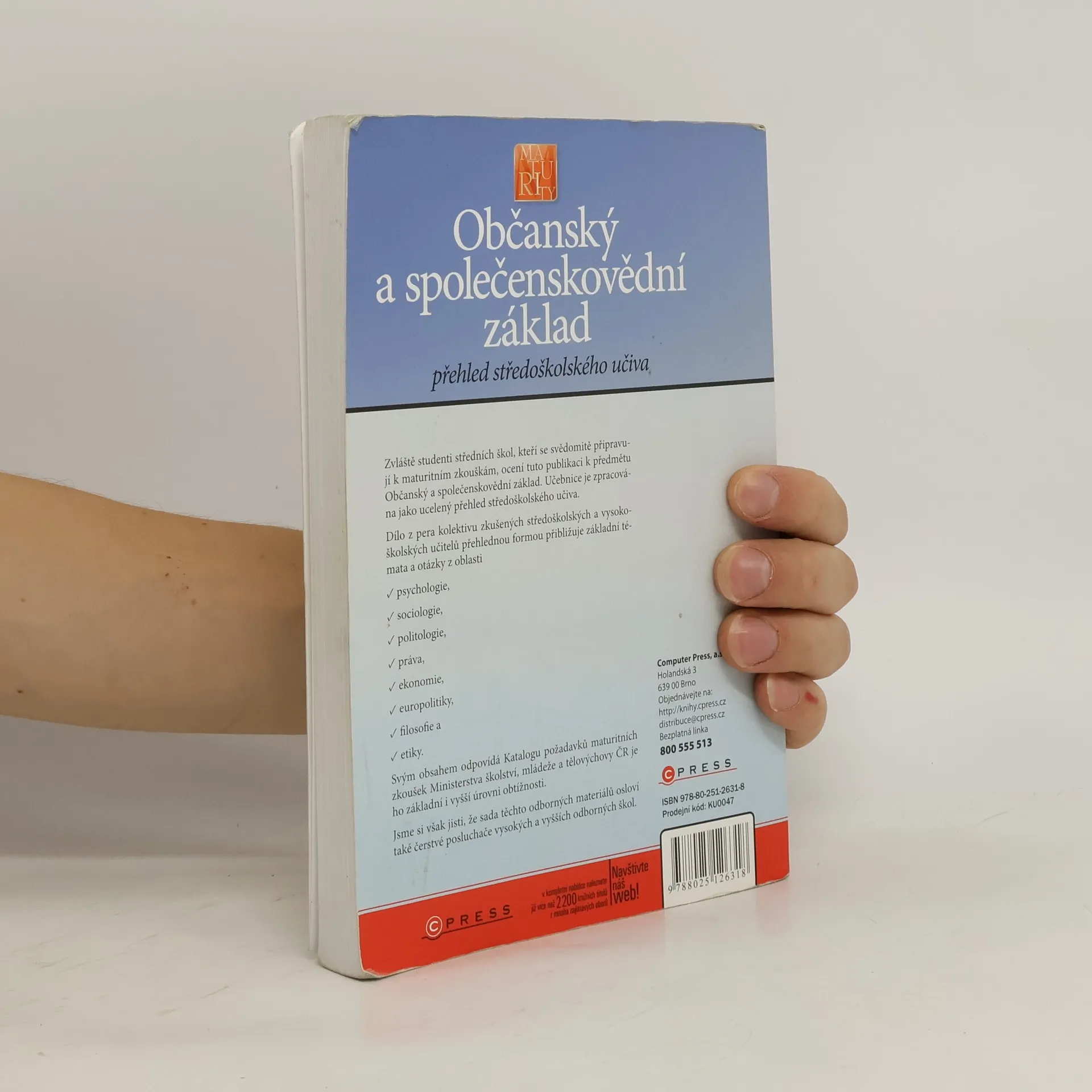 Zvláště studenti středních škol, kteří se svědomitě připravují k maturitním zkouškám, ocení tuto publikaci k předmětu Občanský a společenskovědní základ. Učebnice je zpracována jako ucelený přehled středoškolského učiva. Dílo z pera kolektivu zkušených středoškolských a vysokoškolských učitelů přehlednou formou přibližuje základní témata a otázky z oblasti: - psychologie - sociologie - politologie - práva - ekonomie - europolitiky - filosofie a - etiky. Svým obsahem odpovídá Katalogu požadavků maturitních zkoušek Ministerstva školství, mládeže a tělovýchovy ČR je ho základní i vyšší úrovni obtížnosti. Jsme si však jisti, že sada těchto odborných materiálů osloví také čerstvé posluchače vysokých a vyšších odborných škol.