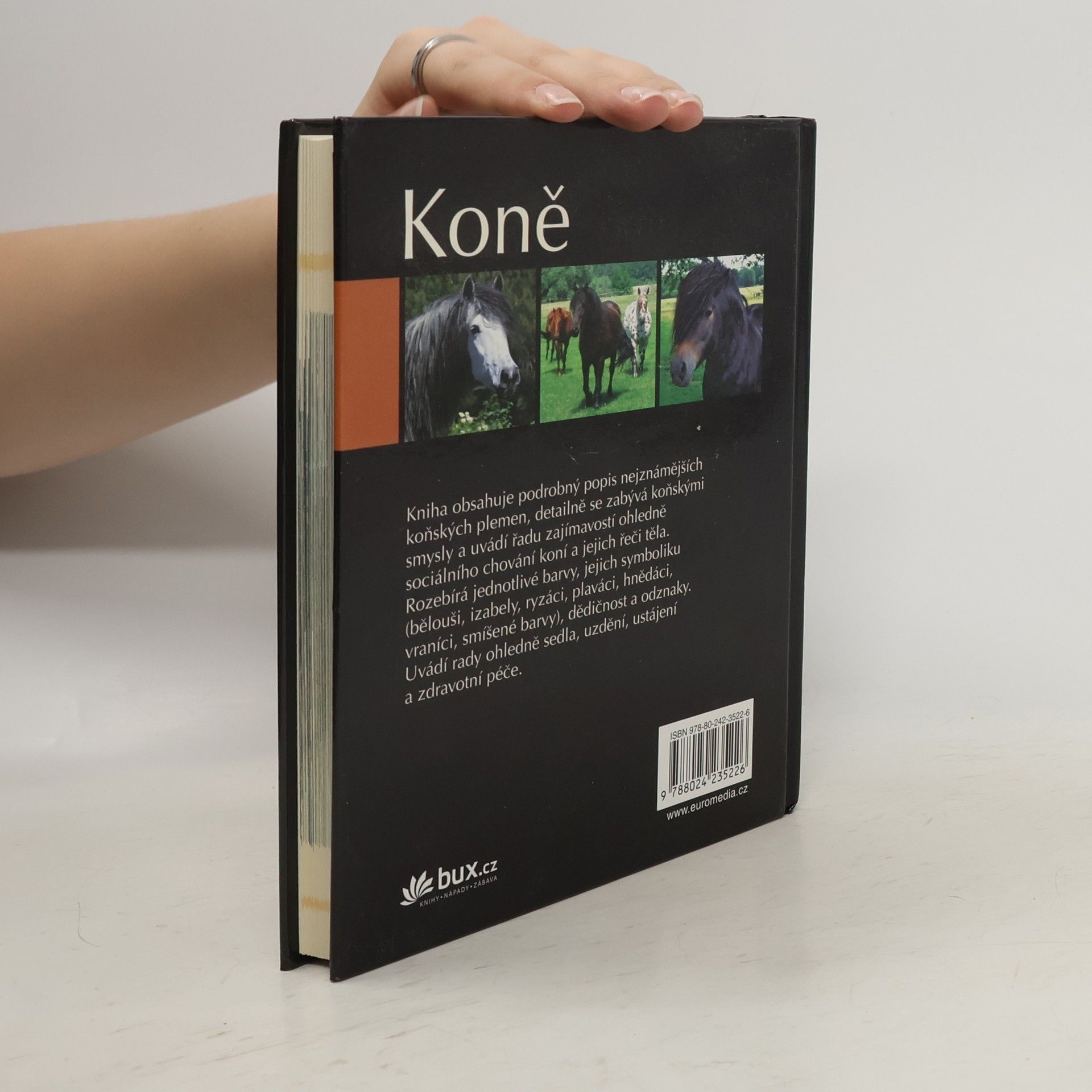 Kniha obsahuje podrobný popis nejznámějších koňských plemen, detailně se zabývá koňskými smysly a uvádí řadu zajímavostí ohledně sociálního chování koní a jejich řeči těla. Rozebírá jednotlivé barvy, jejich symboliku (bělouši, izabely, ryzáci, plaváci hnědáci, vraníci, smíšené barvy), dědičnost a odznaky. Uvádí rady ohledně sedla, uzdění, ustájení a zdravotní péče.