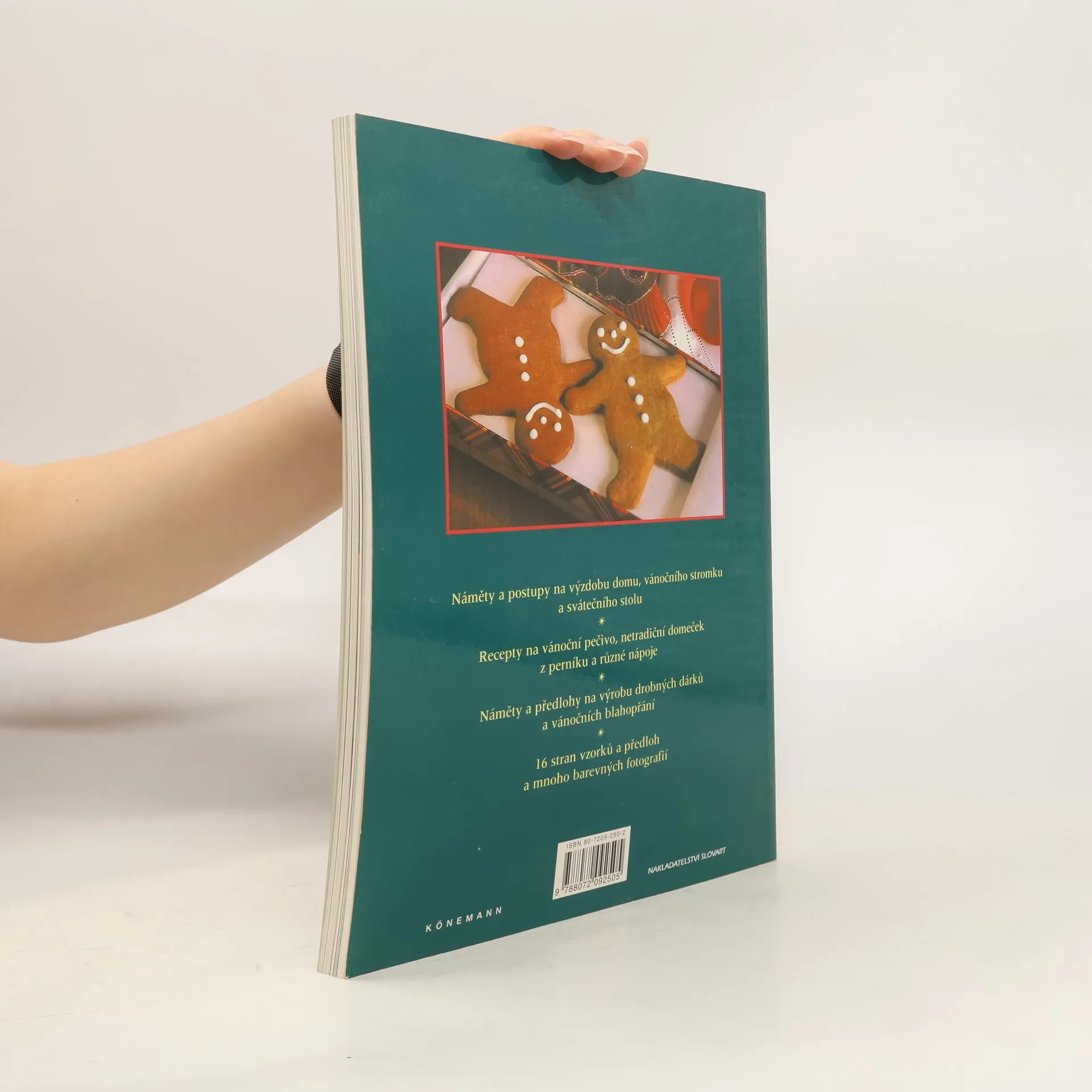 Originálne i klasické nápady na dekorácie na slávnostné chvíle, vianočné darčeky, výzdoba sviatočného stola, recepty na vianočné špeciality, vzory a predlohy. Dekorácie interiéru-Adventný veniec, Adventný kalendár, Girlanda nad kozub, Voňavé pomarančové gule, Linorezové gule, Rám z popínavého brečtanu, Papierové girlandy, Srdce z ruží. Dekorácie na stromček-Girlanda lístia z alobalu, Anjelik, Vianočná ponožtička, Venček, Vianočné koláčiky, Vianočné ozdoby zo slaného cesta, Voňavé vrecúška, Jablkové kytičky. Dekorácie na stôl-Citrusový stromček, Vejárovitý strom, Dekorácia z cezmíny a brečtanu, Ozdobné kartičky, Slávnostné aplikácie, Podšívané obrúsky s ozdobnou dečkou. Sladké maškrty-Medovníkový domček, Medovníkoví snehuliaci, Cukrovinky, Čokoládové pralinky, Cukrové oriešky, Zázvorové trubičky, Čokoládové guľky, Brusnicová pochúťka, Mince Pies /Dukátiky/, Ľahký ovocný koláč, Vianočný hrozienkový puding, Koňakové maslo, Horúce jablkové víno, Rumový punč, Vaječný likér. Nápady na darčeky-Levadnuľové vrecúška, Handrová bábika, Kartónoví vojačikovia, Aromatizované oleje, Vianočná vzorková výšivka, Ozdobné sviečky. Pohľadnice a darčekové balenie-Pruhovaný darčekový papier, Papier so šablónovou maľbou, Darčeková škatuľa, Pletený košíček, Pohľadnice a obálky, Pohľadnice s vystrihovanými sobmi, Pohľadnica v štýle Biedermeiera, Pohľadnica s kolážou. Špeciálne techniky, Predlohy. Vydáno v českém jazyce.