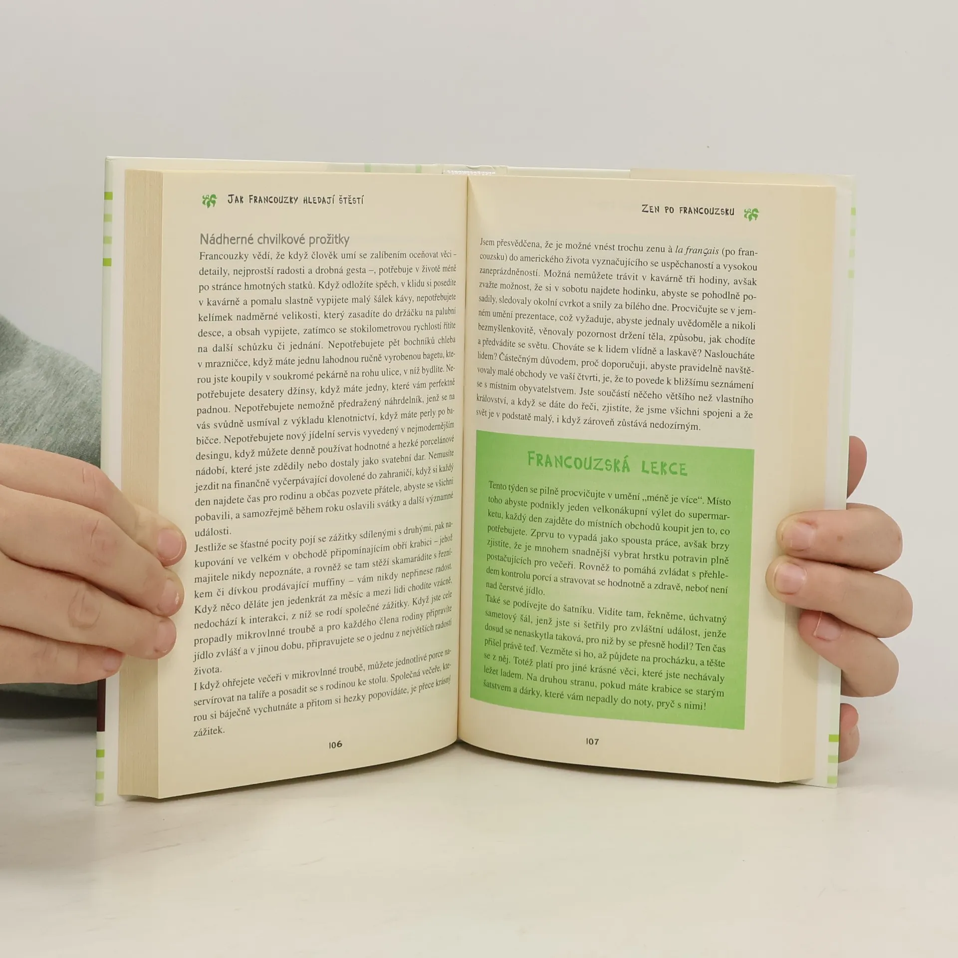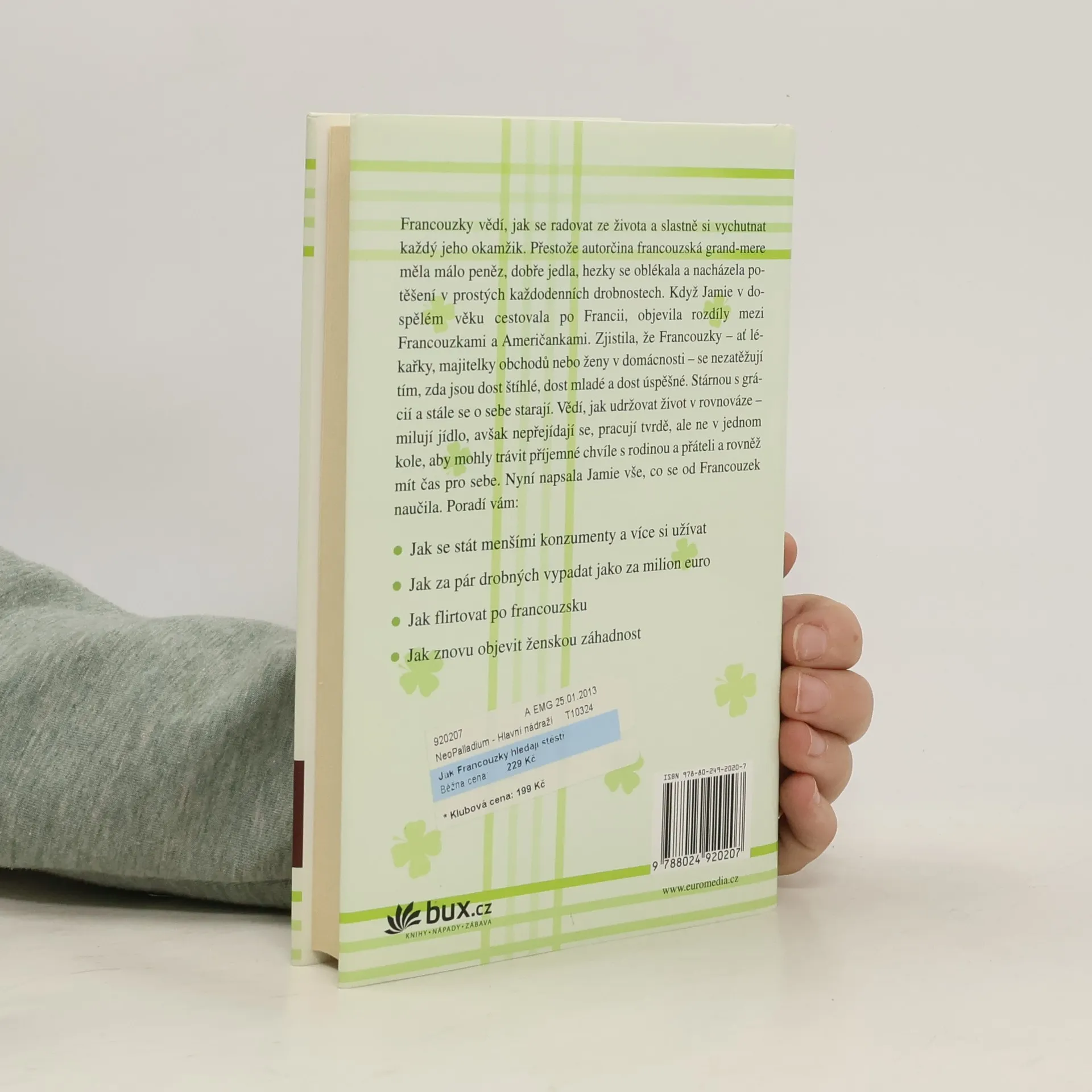 Francouzky vědí, jak se radovat ze života a slastně si vychutnat každý jeho okamžik. Když Jamie cestovala po Francii, zjistila, že Francouzky – ať lékařky, majitelky obchodů nebo ženy v domácnosti – se nezatěžují tím, zda jsou dost štíhlé, dost mladé a dost úspěšné. Stárnou s grácií a stále se o sebe starají. Vědí, jak udržovat život v rovnováze. Autorka vám s moudrostí i humorem poradí, jak se stát menšími konzumenty a více si užívat, jak za pár drobných vypadat jako za milion euro, jak flirtovat po francouzsku a znovu objevit ženskou záhadnost.