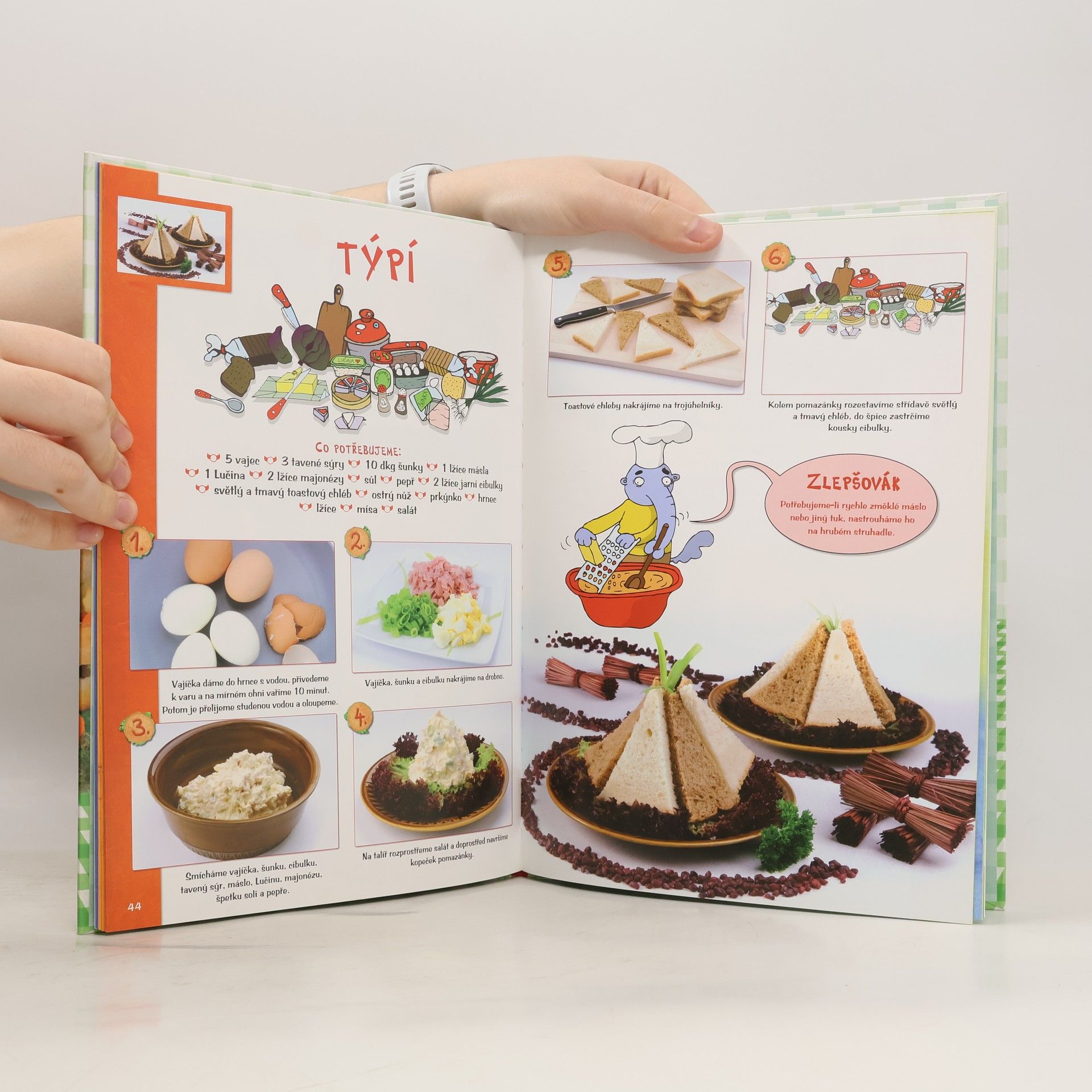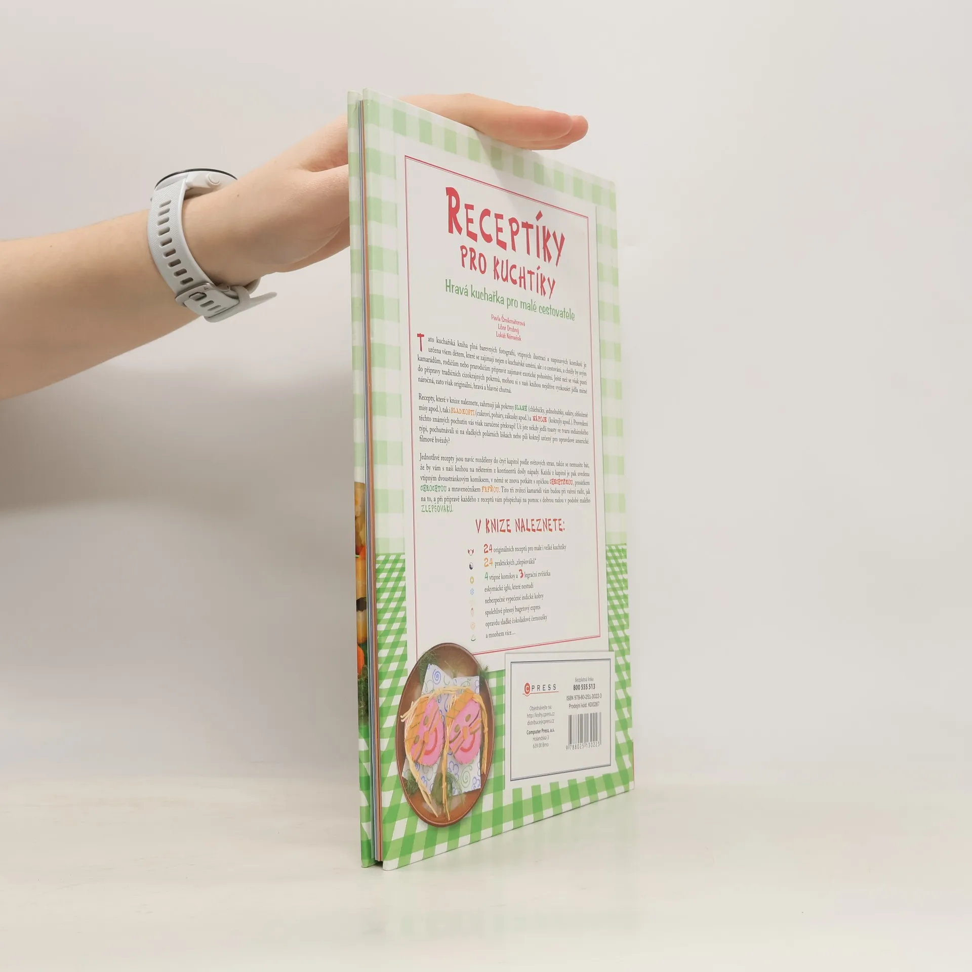 Tato kuchařská kniha plná barevných fotografií, vtipných ilustrací a napínavých komiksů je určena všem dětem, které se zajímají nejen o kuchařské umění, ale i o cestování, a chtěly by svým kamarádům, rodičům nebo prarodičům připravit zajímavé exotické pohoštění. Ještě než se však pustí do přípravy tradičních cizokrajných pokrmů, mohou si s naší knihou nejdříve vyzkoušet jídla méně náročná, zato však originální, hravá a hlavně chutná. Recepty, které v knize naleznete, zahrnují jak pokrmy SLANÉ (chlebíčky, jednohubky, saláty, obložené mísy apod.), tak i SLADKOSTI (cukroví, poháry, zákusky apod.) a NÁPOJE (koktejly apod.). Provedení těchto známých pochutin vás však zaručeně překvapí! Už jste někdy jedli toasty ve tvaru indiánského týpí, pochutnávali si na sladkých polárních liškách nebo pili koktejl určený pro opravdové americké filmové hvězdy? Jednotlivé recepty jsou navíc rozděleny do čtyř kapitol podle světových stran, takže se nemusíte bát, že by vám s naší knihou na některém z kontinentů došly nápady. Každá z kapitol je pak uvedena vtipným dvoustránkovým komiksem, v němž se znova potkáte s opičkou CHECHTIČKOU, prasátkem CHROCHTOU a mravenečníkem FRFŇOU. Tito tři zvířecí kamarádi vám budou při vaření radit, jak na to, a při přípravě každého z receptů vám přispěchají na pomoc s dobrou radou v podobě malého ZLEPŠOVÁKU.