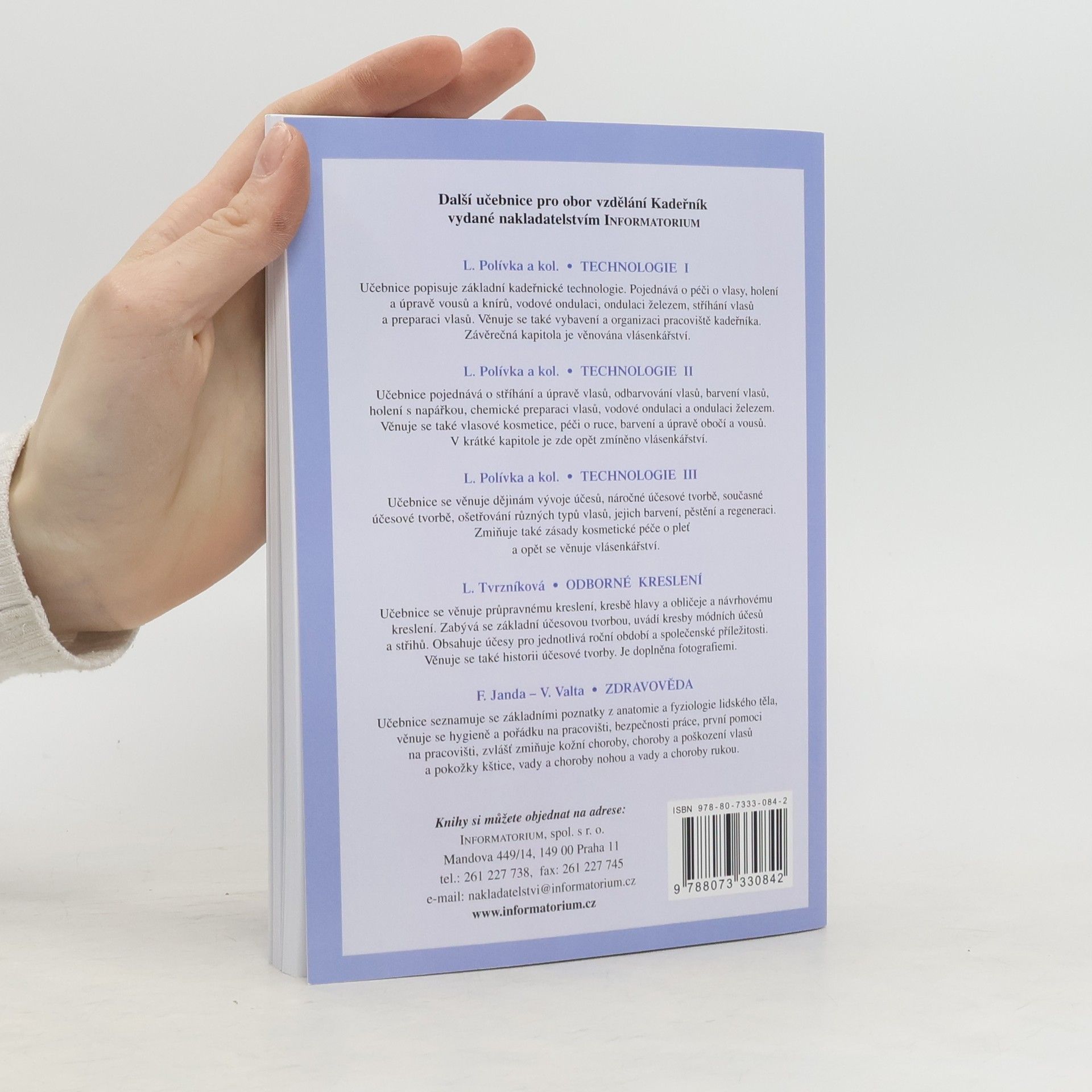 Popisuje stavbu, základní funkce a vlastnosti vlasů a kůže. Seznamuje s materiály používanými v kadeřnické praxi a s jejich fyzikálním i chemickým působením na vlasy a pokožku. Dostatečné množství názorného materiálu pomůže studentům osvojit si látku, která předpokládá určité znalosti chemie a technologie.