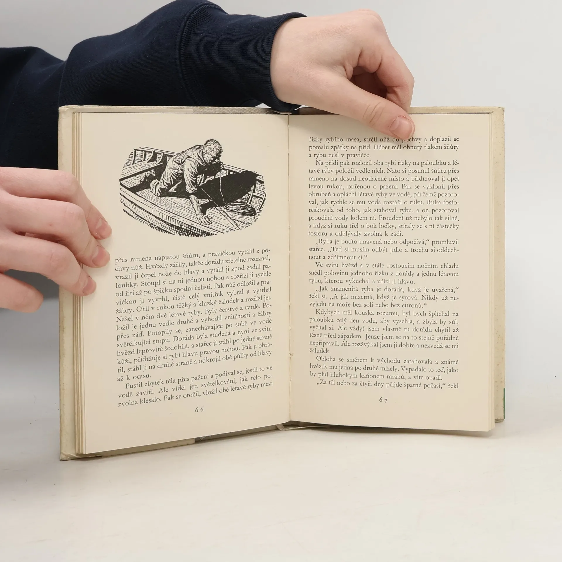 Starý rybář vyjíždí na sklonku svých dní na moře, přemůže obrovskou velrybu a vrací se s její kostrou, když byl jeho úlovek napaden žraloky. V tomto prostém ději je symbolisován odvěký zápas člověka s přírodou, nezadržitelnost ovládání přírody člověkem. Stařec ač sám uprostřed širokých vod, s nimiž srostl a dokonale je zná, není sám. Myslí na chlapce, kterého učil lovit, ví, že se o něj na břehu starají druzi. Vrací se z lovu s prázdnou vysílen a raněn. Přesto jeho příběh není pesimistický, naopak, brzy se s chlapcem vydají na nový lov. Novela (v r. 1954 Nobelova cena) výrazně ukazuje osobitý autorův vztah ke světu, způsob jeho vidění reality i způsob vyjádření. Je to oslava lidské statečnosti a houževnatosti s apotheosou lidské družnosti a závěrečném doslovu stručná charakteristika autorova života a díla.
