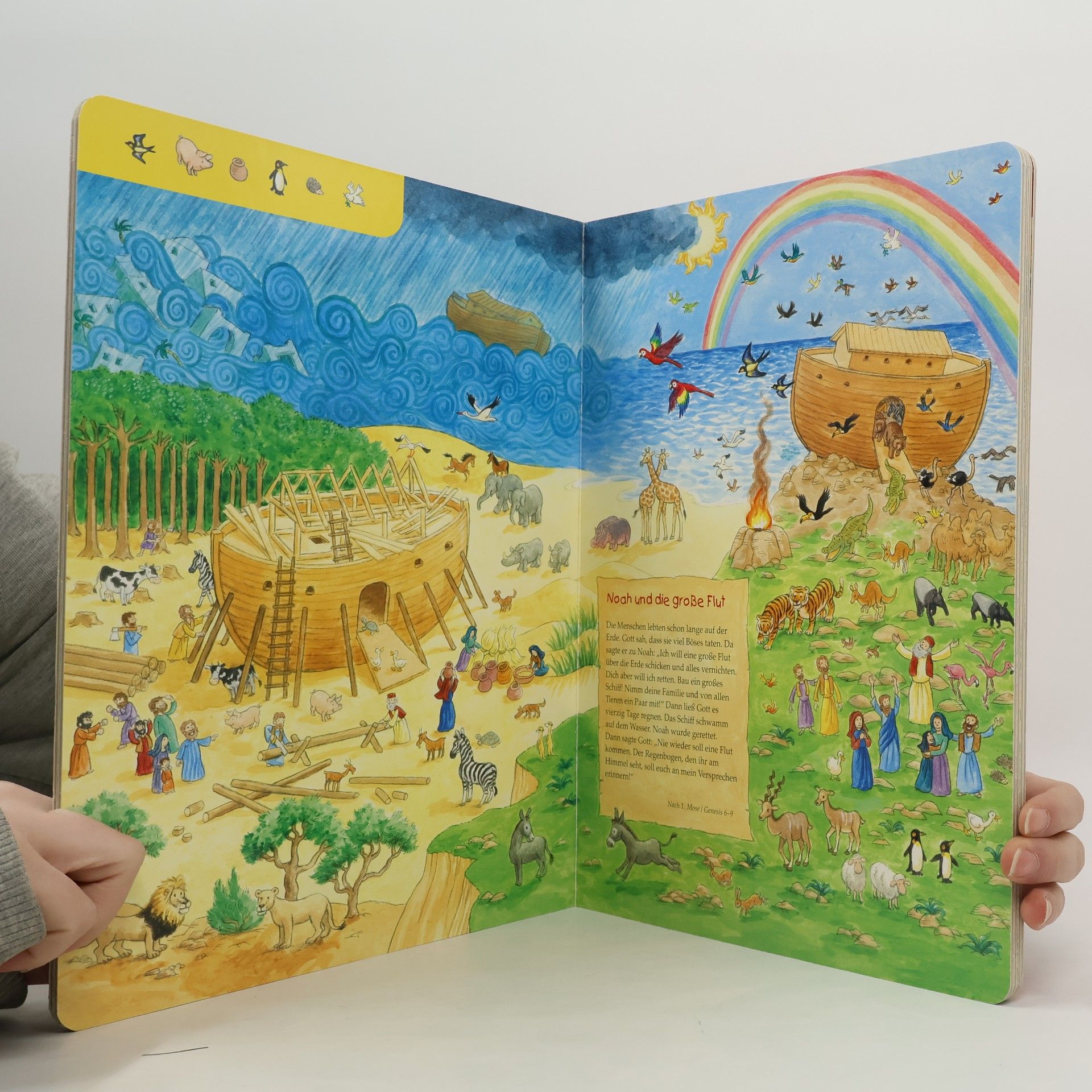 Dieses farbenfroh illustriere Wimmelbuch lädt schon die Kleinsten dazu ein, einige der beliebtesten Geschichten der Bibel spielerisch zu entdecken: Gott erschafft die Welt, Noah und die große Flut, Gott sendet Mose, David wird König, Jona und der Fisch. Auf den großformatigen Bildern gibt es neben der kindgerechten Nacherzählung der Geschichten viele Details zu sehen. Zugleich wird das Kind angeregt, ausgewählte kleine Motive zu entdecken, die auf den einzelnen Seiten abgebildet sind: Such mit! Findest du die Taube, das Schaf die Wolke?
