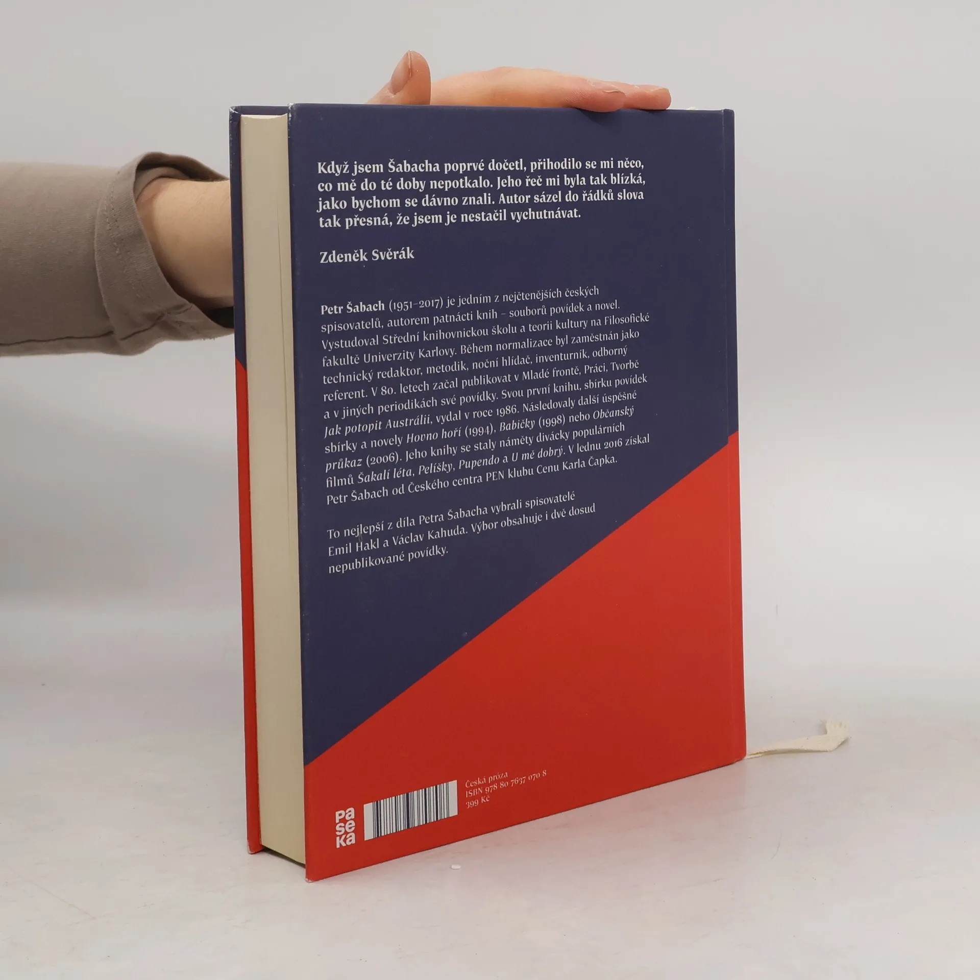 Literární svět Petra Šabacha je královstvím, ve kterém namísto trůnu stojí hospodská židle, okolo stolu sedí štamgasti a rytířský řád se udílí za dobrý příběh. Na život se tu dívá skrz půllitr s pivem, aby získal patřičně komické rysy a nostalgickou náladu, a pije se svižně, aby nespadla pěna. Autorský styl Petra Šabacha představuje nejzákladnější formu, na níž stojí literatura - poutavě odvyprávěnou a vypointovanou historku, kterou ovládl osobitým stylem, s autenticitou a nadsázkou. Šabach se tak posadil k jednomu stolu s Jaroslavem Haškem a Bohumilem Hrabalem. Napsal desítky povídek a románů, z nichž některé byly zpracovány filmově a staly se sdílenou výpovědí o konci normalizace a náhle svobodných devadesátých letech. Výběr toho nejlepšího z Šabachova díla doplněný dosud nepublikovanými povídkami připravili spisovatelé Emil Hakl a Václav Kahuda, předmluvu napsal autorův přítel Zdeněk Svěrák.