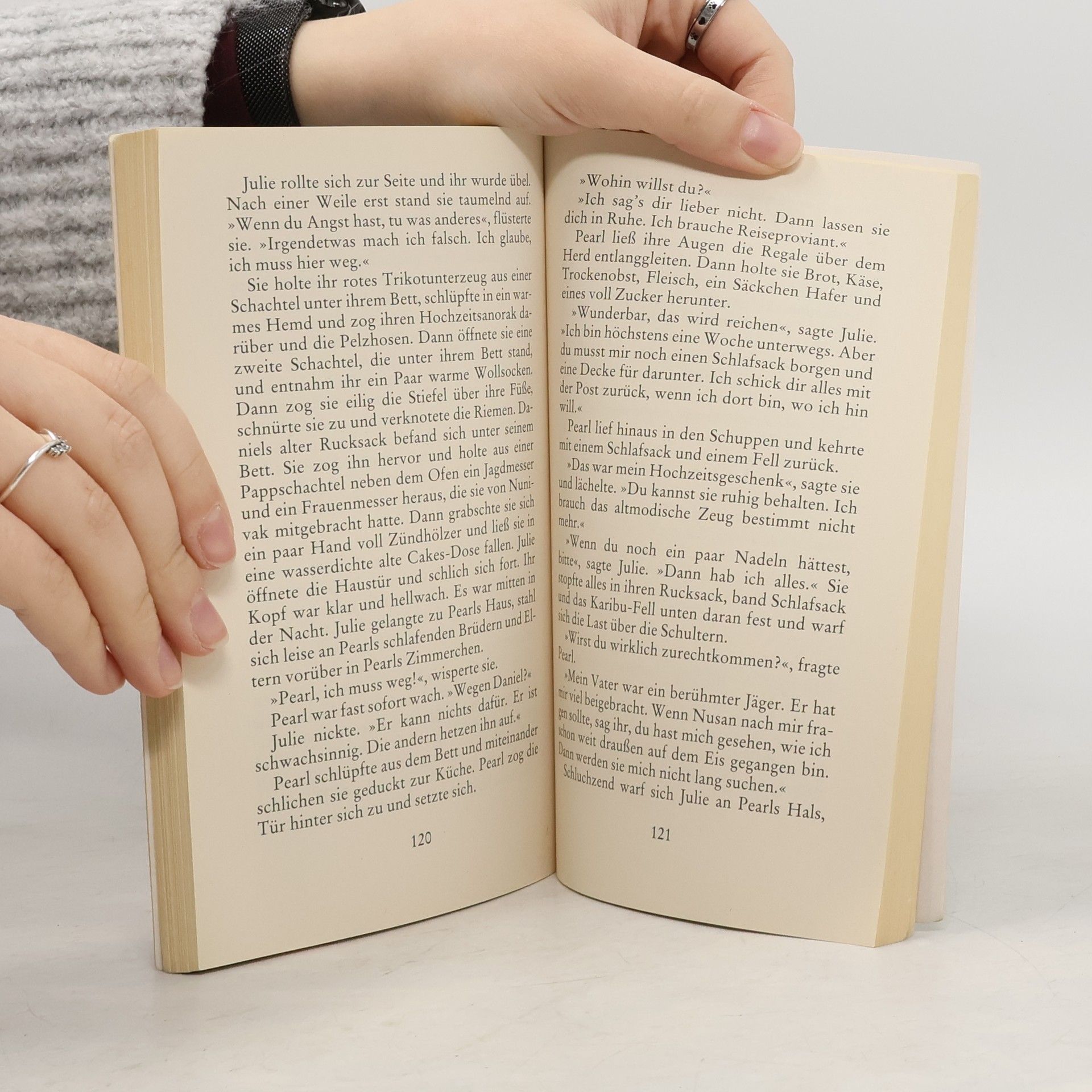 Julie, ein dreizehnjähriges Eskimomädchen, ist aus einer nach altem Brauch geschlossenen Kinderehe geflüchtet. Sie verirrt sich in der arktischen Tundra und sieht ihre einzige Überlebenschance darin, sich einem Wolfsrudel anzuschließen. Wie das geschieht, wie das Mädchen die Wölfe beobachtet, ihr Verhalten studiert, sich ihre Laute und Gebärdensprache aneignet und schließlich von ihnen angenommen wird, ist poetisch und spannend zugleich geschildert. Abenteuer, Erlebnis und die Erkenntnisse der Verhaltensforschung gehen ohne Bruch ineinander über.
