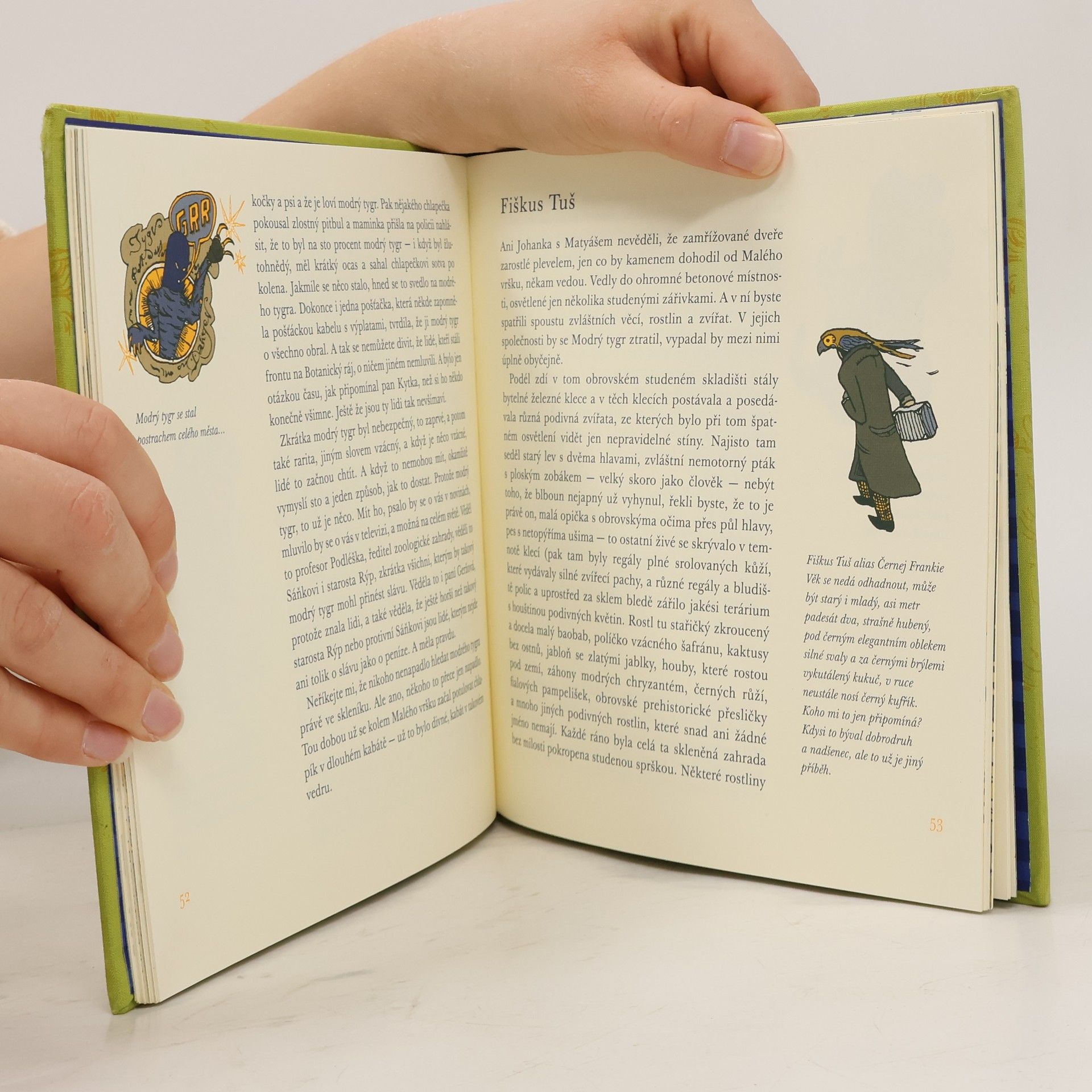 Jednoho letního dne se na křižovatce objeví modrý tygr, devítileté Johance se spustí krev z nosu a Matyáš přilepí stěžeň k trupu lodi... Do přístavu právě dorazil slavný cestovatel a nad městem se začnou kupit těžké mraky.Čtivá, zábavná i napínavá knížka vypráví o dvou kamarádech, botanické zahradě a jednom neobvyklém tygrovi. V malé botanické zahradě uprostřed hlučného města, žije devítiletá Johanka a její kamarád Matyáš, syn věčně rozmrzelého zahradníka Kytky. Botanická zahrada je ale v ohrožení. Starosta přemýšlí, že by ji mohli zavřít, protože je na příliš pěkném pozemku. Jednoho dne se ale objeví Modrý tygr. Velká záhadná událost. Média z něj udělají legendu, připisují mu zločiny a také nalezené obří stopy. Každý po něm pátrá a snaží se na tom vydělat. Modrý tygr ale najde útočiště v botanické zahradě a Johanka s Matyášem se o něj tajně starají. Modrý tygr umí dělat zázraky. Zahrada překrásně vykvete a najednou se lidé začnou zajímat, proč má být taková krása zničena. Někdo ale Modrého tygra přeci jen najde a ukradne. Ale může být ukradena legenda?... celý text