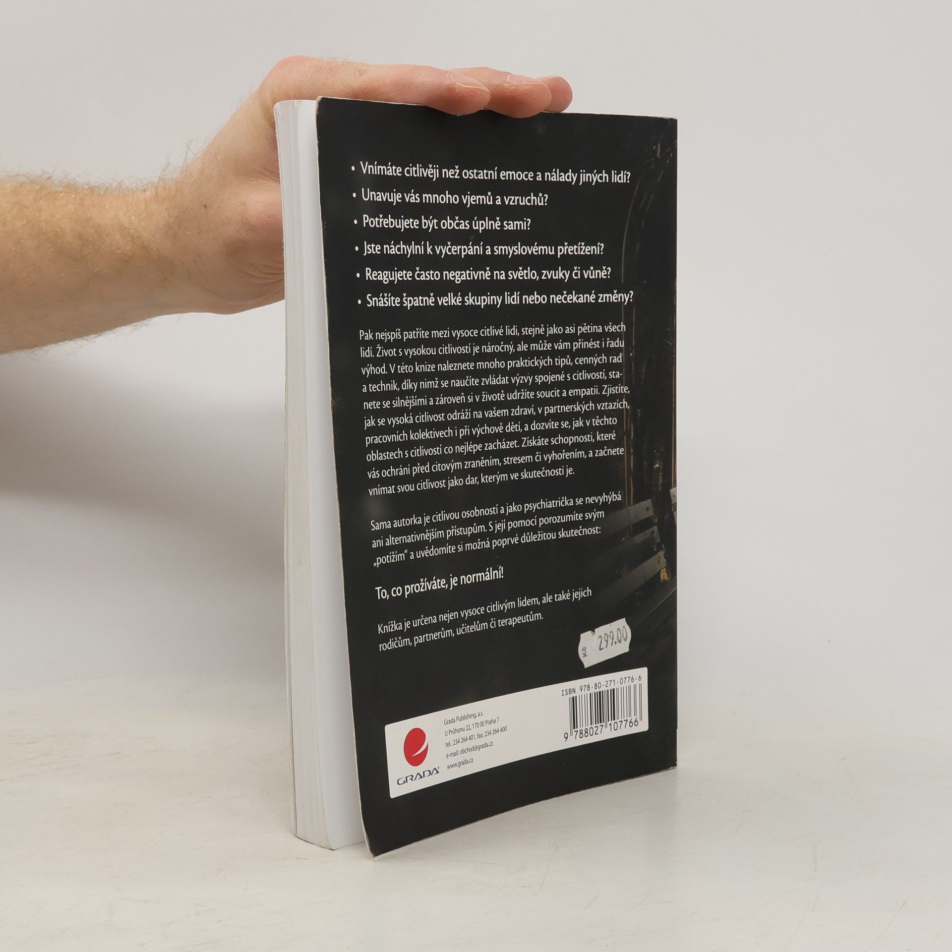 Vnímáte citlivěji než ostatní emoce a nálady jiných lidí? Unavuje vás mnoho vjemů a vzruchů? Potřebujete být občas úplně sami? Jste náchylní k vyčerpání a smyslovému přetížení? Reagujete často negativně na světlo, zvuky či vůně? Snášíte špatně velké skupiny lidí nebo nečekané změny? Pak nejspíš patříte mezi vysoce citlivé lidi, stejně jako asi pětina všech lidí. Život s vysokou citlivostí je náročný, ale může vám přinést i řadu výhod. V této knize naleznete mnoho praktických tipů, cenných rad a technik, díky nimž se naučíte zvládat výzvy spojené s citlivostí, stanete se silnějšími a zároveň si v životě udržíte soucit a empatii. Zjistíte, jak se vysoká citlivost odráží na vašem zdraví, v partnerských vztazích, pracovních kolektivech i při výchově dětí, a dozvíte se, jak v těchto oblastech s citlivostí co nejlépe zacházet. Získáte schopnosti, které vás ochrání před citovým zraněním, stresem či vyhořením, a začnete vnímat svou citlivost jako dar, kterým ve skutečnosti je. Sama autorka je citlivou osobností a jako psychiatrička se nevyhýbá ani alternativnějším přístupům. S její pomocí porozumíte svým „potížím“ a uvědomíte si možná poprvé důležitou skutečnost: To, co prožíváte, je normální! Knížka je určena nejen vysoce citlivým lidem, ale také jejich rodičům, partnerům, učitelům či terapeutům.