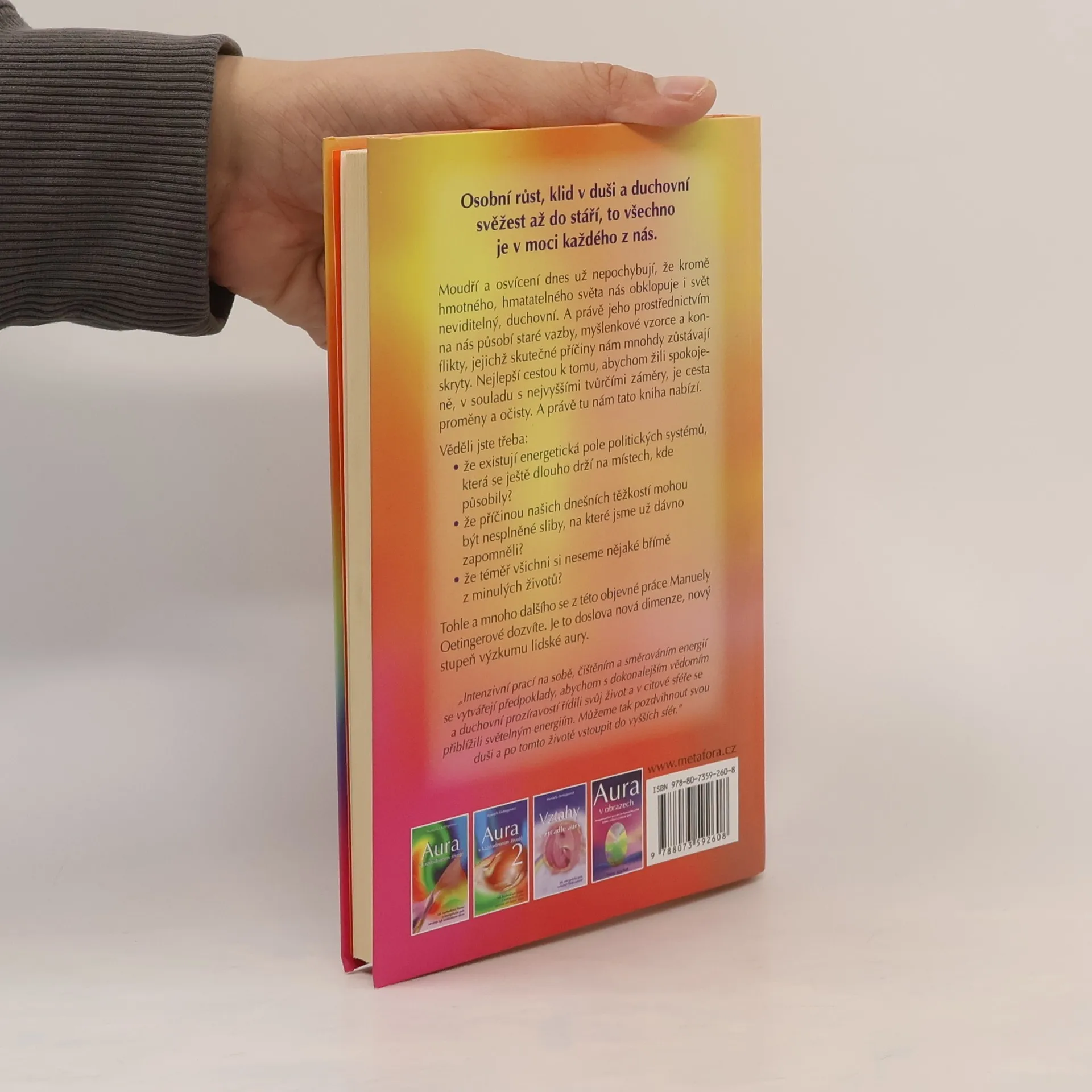 Cesta k poznání a vědomé přeměně energetických polí - pro jasnou mysl ve stáří a pokrok na duchovní cestě… Od autorky již vyšlo: Aura v každodenním životě, Aura v každodenním životě 2, Vztahy v zrcadle aury Nejlepší cestou k tomu, abychom žili spokojeně, v souladu s nejvyššími tvůrčími záměry, je cesta proměny a očisty. A právě tu nám tato kniha nabízí. Dáme-li se vést svou intuicí, pochopíme vliv cizích i vlastních energií a naučíme se s nimi pracovat, máme velikou naději, že se osvobodíme od svazujících pout a budeme si nejenom užívat spokojeného života, ale staneme se přínosem i pro druhé. Autorka se ale neomezuje jen na teorii. Na celé řadě příkladů ze života ukazuje, jaké zákonitosti v duchovní rovině působí a jak je třeba s nimi zacházet. Otevírá tak čtenářům přístup ke zcela novému horizontu, který pomáhá pochopit skutečné příčiny obvyklých problémů. Je to doslova nová dimenze, nový stupeň výzkumu lidské aury.