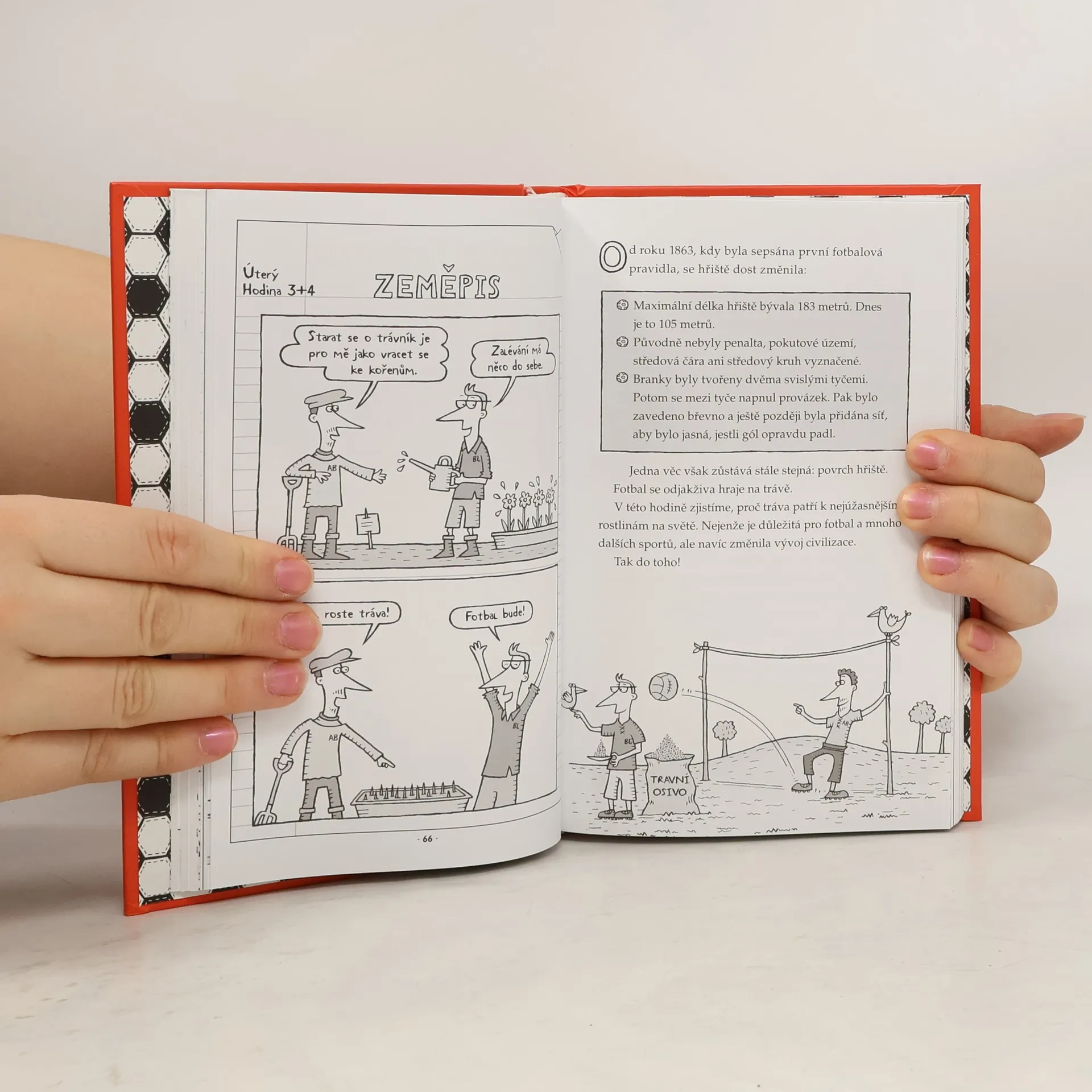 Představ si školu, kde by se na každé hodině probíral jen fotbal! A rovnou na hřišti! Tahle úžasná kniha plná fotbalového hýření, žebříčků, výsledků, překvapujících faktů a zajímavostí tě provede tou nejbáječnější školou na světě. Její autoři věří, že fotbal tě naučí spoustu věcí o světě. Ve fyzice se dozvíš, že fotbalové míče ve skutečnosti nejsou kulaté! V zeměpise očicháš dinosauří bobek a zjistíš z něj něco o trávě. A uměl bys říct, jestli jsou leváci častěji kluci, nebo holky? Autoři ti to poví v hodině biologie. Fotbalová škola je prostě úžasná!