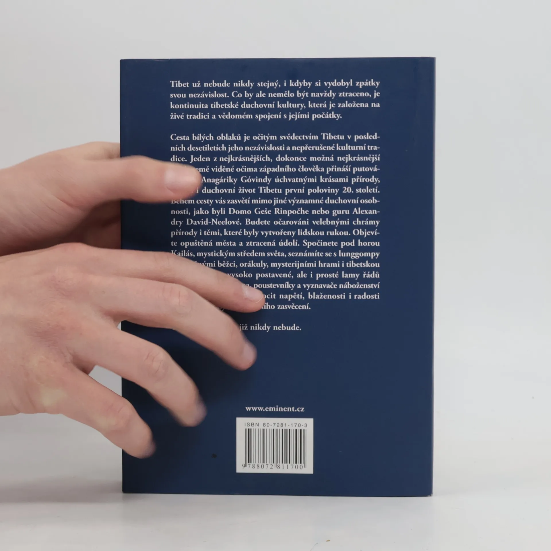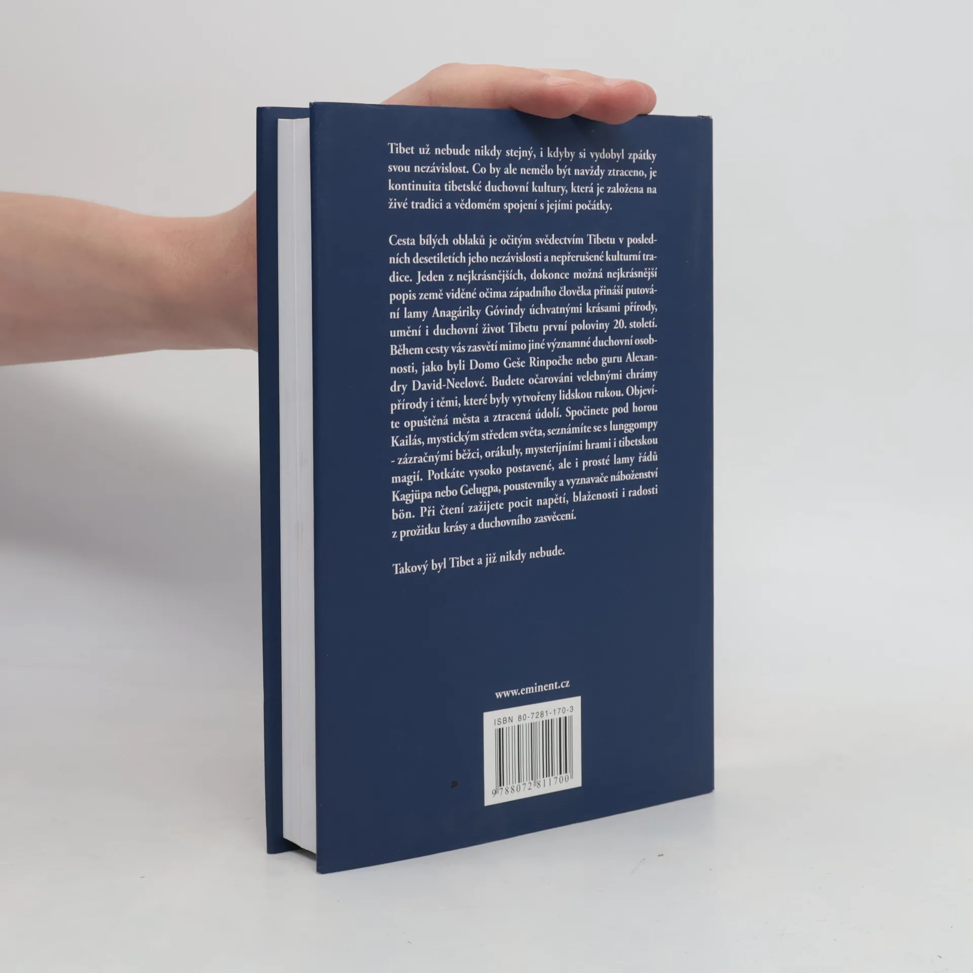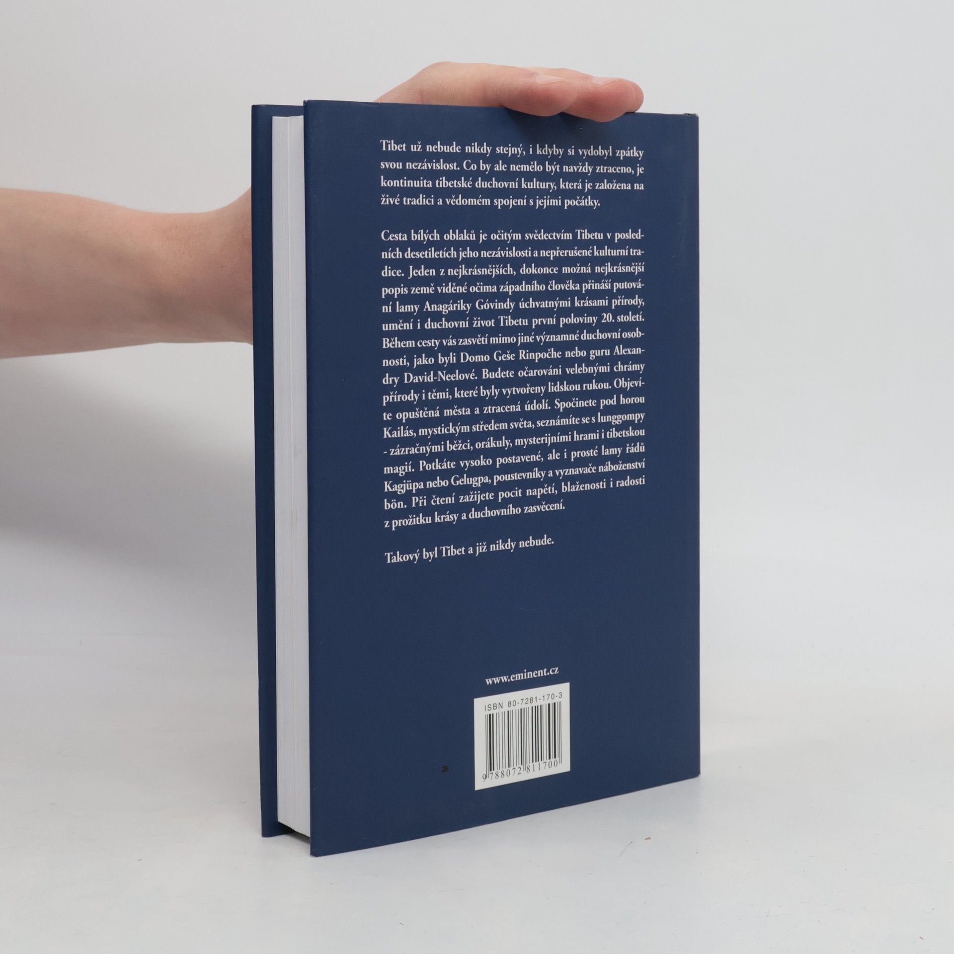 Tibet už nebude nikdy stejný, i kdyby si vydobyl zpátky svou nezávislost. Co by ale nemělo být navždy ztraceno, je kontinuita tibetské duchovní kultury, která je založená na živé tradici a vědomém spojení s jejími počátky. Cesta bílých oblaků je očitým svědectvím Tibetu v posledních desetiletích jeho nezávislosti a nepřerušené kulturní tradice. Jeden z nejkrásnějších, dokonce možná nejkrásnější popis země viděné očima západního člověka přináší putování lamy Anagáriky Govindy úchvatnými krásami přírody, umění i duchovního života Tibetu první poloviny 20. století. Během putování vás zasvětí mimo jiné významné duchovní osobnosti jako byli Domo Geše Rinpočhe nebo guru Alexandry David-Neelové. Budete očarováni velebnými chrámy přírody i těmi, které byly vytvořeny lidskou rukou. Objevíte opuštěná města, ztracená údolí. Spočinete pod horou Kailás, mystickým středem světa. Seznámíte se s lunggompy - zázračnými běžci, orákuly, mysterijními hrami i tibetskou magií. Potkáte vysoko postavené, ale i prosté lamy řádů Kagjüpa nebo Gelugpa, poustevníky i vyznavače náboženství bön. Při čtení zažijete pocit napětí, blaženosti i radosti z prožitku krásy a duchovního zasvěcení. Takový byl Tibet a již nikdy nebude.