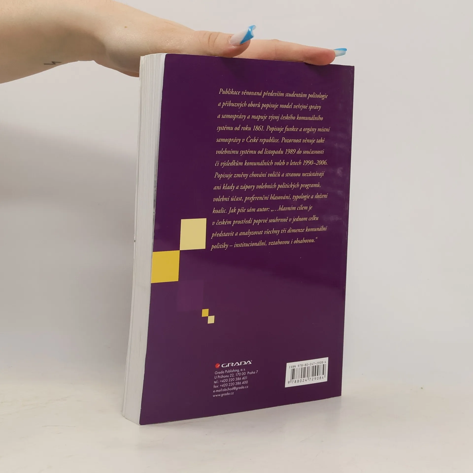 Publikace věnovaná především studentům politologie a příbuzných oborů popisuje model veřejné správy a samosprávy a mapuje vývoj českého komunálního systému od roku 1861. Popisuje funkce a orgány místní samosprávy v České republice. Pozornost věnuje také volebnímu systému od listopadu 1989 do současnosti či výsledkům komunálních voleb v letech 1990-2006. Popisuje změny chování voličů a stranou nezůstávají ani klady a zápory volebních politických programů, volební účast, preferenční hlasování, typologie a složení koalic. Jak píše sám autor: "...hlavním cílem je v českém prostředí poprvé souhrnně v jednom celku představit a analyzovat všechny tři dimenze komunální politiky - institucionální, vztahovou i obsahovou."