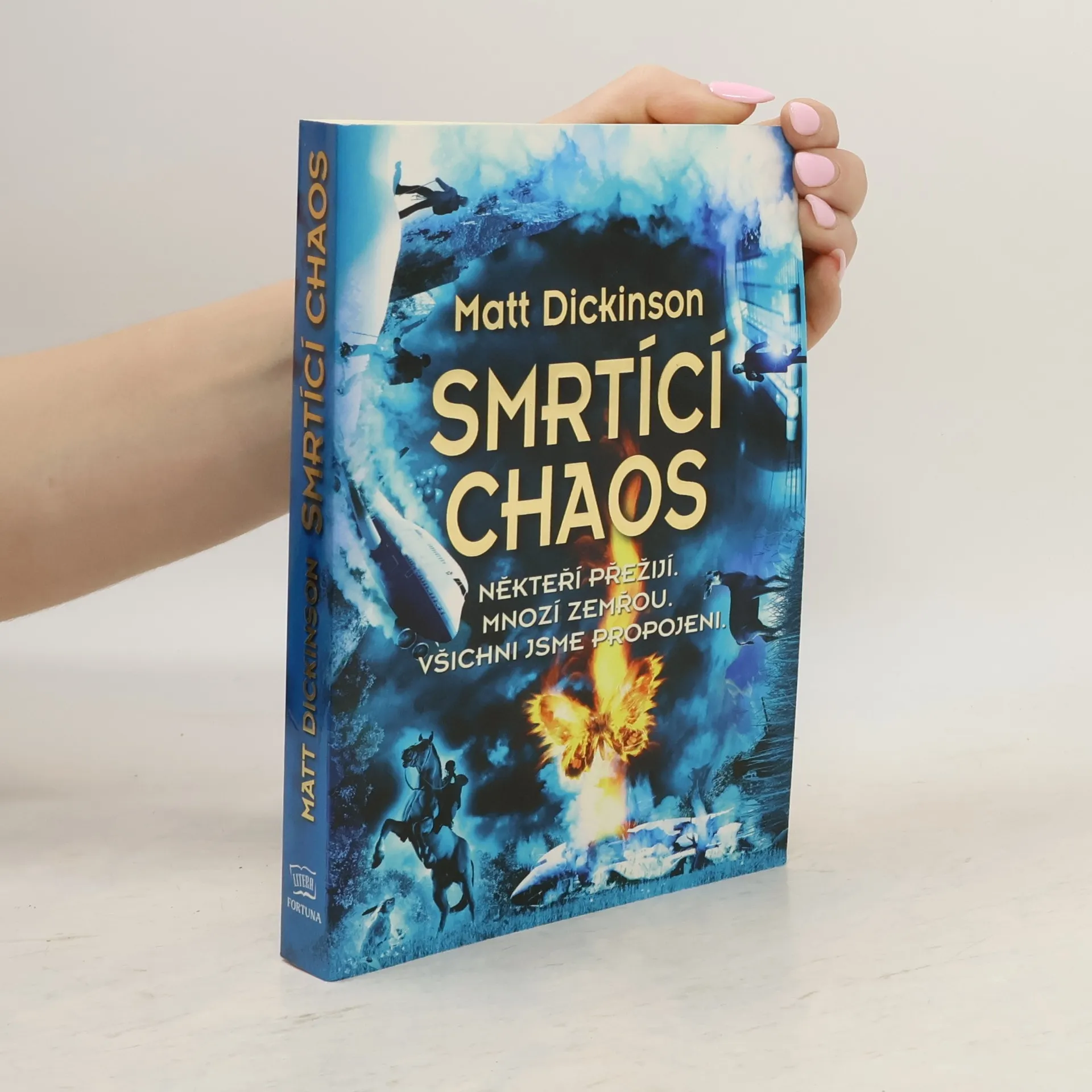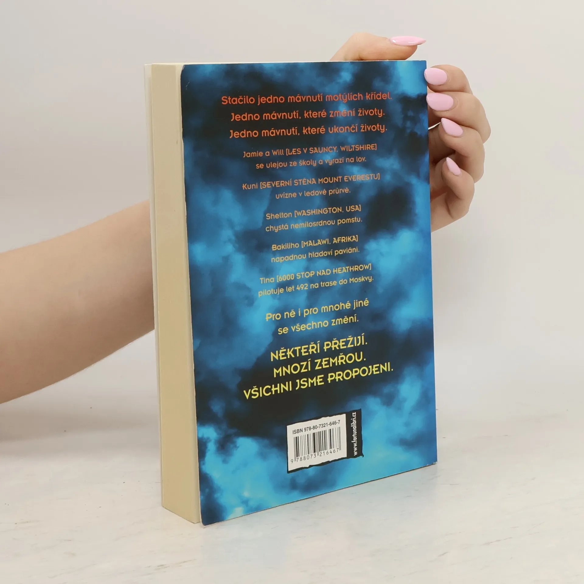 Zdánlivá drobnost – mávnutí motýlích křídel – uvede do chodu řetězec dramatických událostí a osudově ovlivní životy mnoha lidí. Matt Dickinson ve své mistrně napsané próze zavede čtenáře v krátkých „klipových“ vstupech do rozličných prostředí – třeba na severní stěnu Mount Everestu, na palubu Boeingu 747, k jezeru Malawi, na dostihovou dráhu – a nechá je se zatajeným dechem sledovat klíčové okamžiky v životě svých hrdinů. Román vycházející z teorie chaosu je určen všem, kdo milují napětí, ale nespokojí se jen s povrchní četbou. Klade řadu provokativních otázek a přináší překvapivé odpovědi. Někteří přežijí. Jiní zemřou. Všichni jsme propojeni. -- zdroj: www.legie.info --