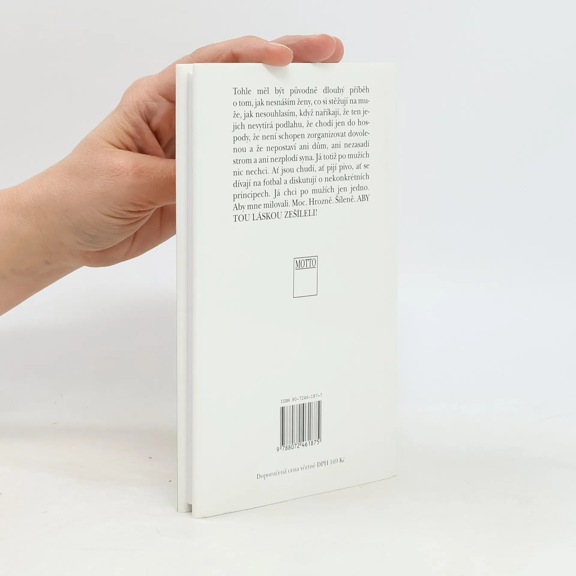 Populární sbírka fejetonů na věčné téma. Osobité postřehy dokáže autorka líčit s neopakovatelným vtipem a ironií. Tohle měl být původně dlouhý příběh o tom, jak nesnáším ženy, co si stěžují na muže, jak nesouhlasím, když naříkají, že ten jejich nevytírá podlahu, že chodí jen do hospody, že není schopen zorganizovat dovolenou a že nepostaví ani dům, ani nezasadí strom a ani nezplodí syna. Já totiž po mužích nic nechci. Ať jsou chudí, ať pijí pivo, ať se dívají na fotbal a diskutují o nekonkrétních principech. Já chci po mužích jen jedno. Aby mne milovali. Moc. Hrozně. Šíleně. ABY TOU LÁSKOU ZEŠÍLELI!