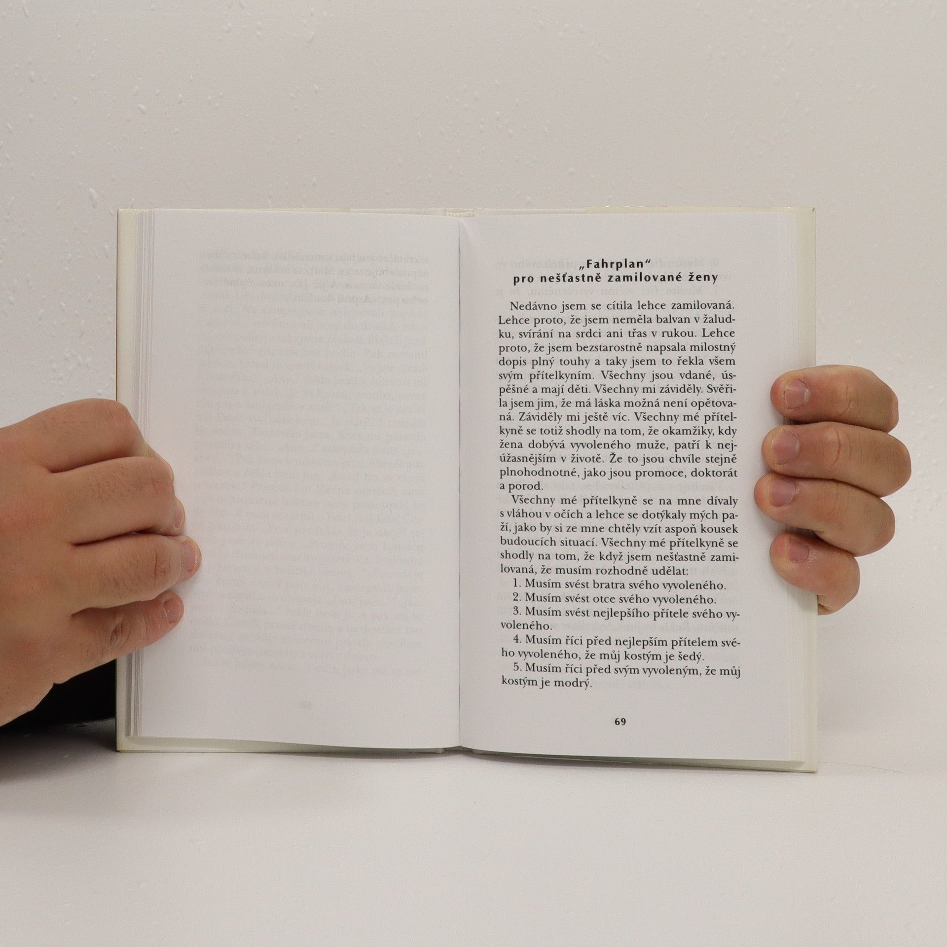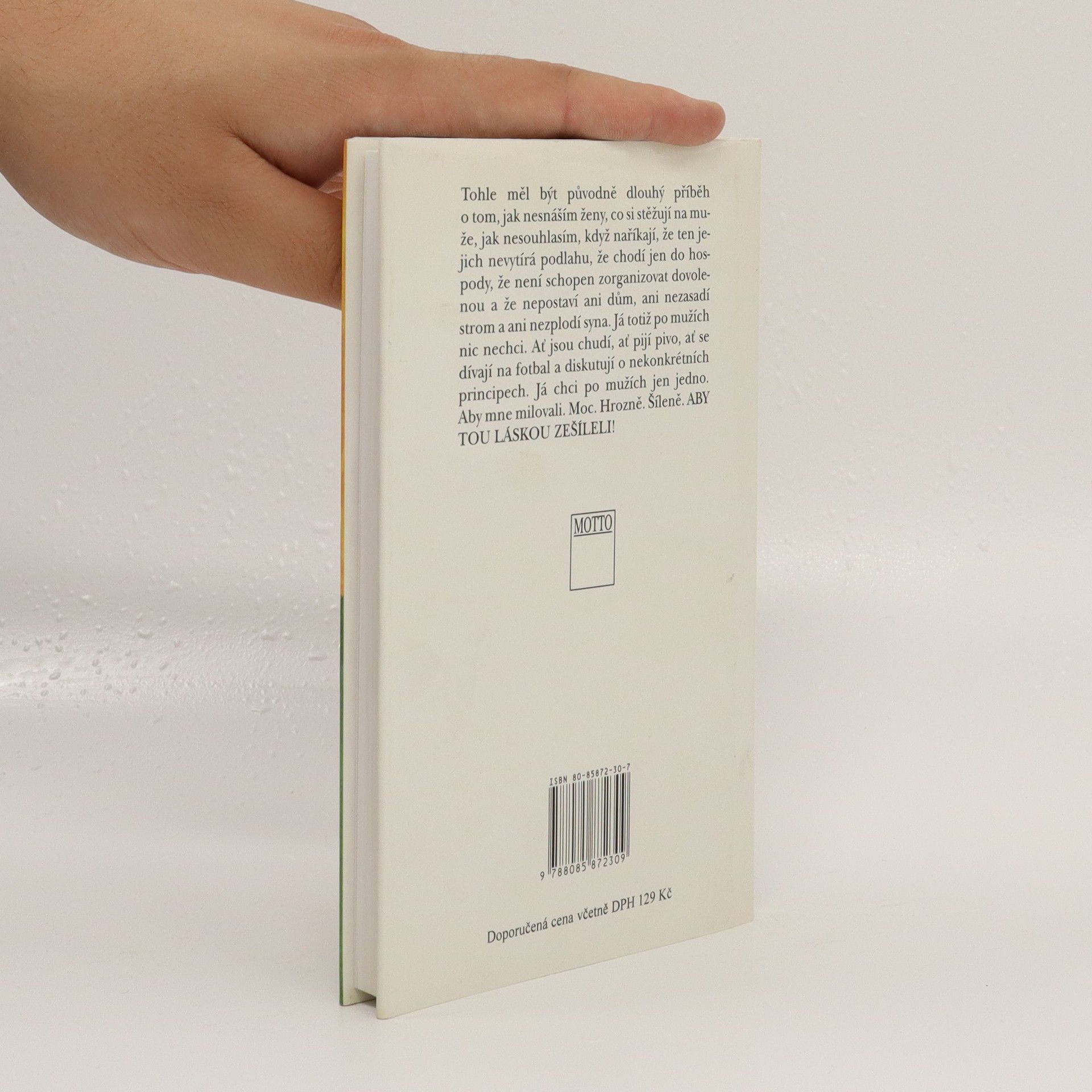 Populární sbírka fejetonů na věčné téma. Osobité postřehy dokáže autorka líčit s neopakovatelným vtipem a ironií. Tohle měl být původně dlouhý příběh o tom, jak nesnáším ženy, co si stěžují na muže, jak nesouhlasím, když naříkají, že ten jejich nevytírá podlahu, že chodí jen do hospody, že není schopen zorganizovat dovolenou a že nepostaví ani dům, ani nezasadí strom a ani nezplodí syna. Já totiž po mužích nic nechci. Ať jsou chudí, ať pijí pivo, ať se dívají na fotbal a diskutují o nekonkrétních principech. Já chci po mužích jen jedno. Aby mne milovali. Moc. Hrozně. Šíleně. ABY TOU LÁSKOU ZEŠÍLELI!