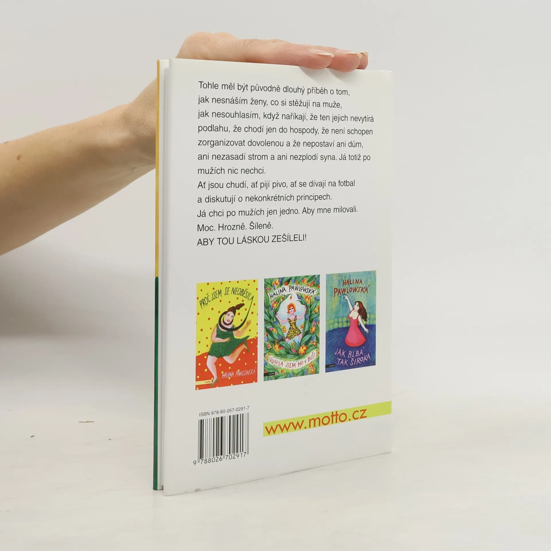 Populární sbírka fejetonů na věčné téma. Osobité postřehy dokáže autorka líčit s neopakovatelným vtipem a ironií. Tohle měl být původně dlouhý příběh o tom, jak nesnáším ženy, co si stěžují na muže, jak nesouhlasím, když naříkají, že ten jejich nevytírá podlahu, že chodí jen do hospody, že není schopen zorganizovat dovolenou a že nepostaví ani dům, ani nezasadí strom a ani nezplodí syna. Já totiž po mužích nic nechci. Ať jsou chudí, ať pijí pivo, ať se dívají na fotbal a diskutují o nekonkrétních principech. Já chci po mužích jen jedno. Aby mne milovali. Moc. Hrozně. Šíleně. ABY TOU LÁSKOU ZEŠÍLELI!