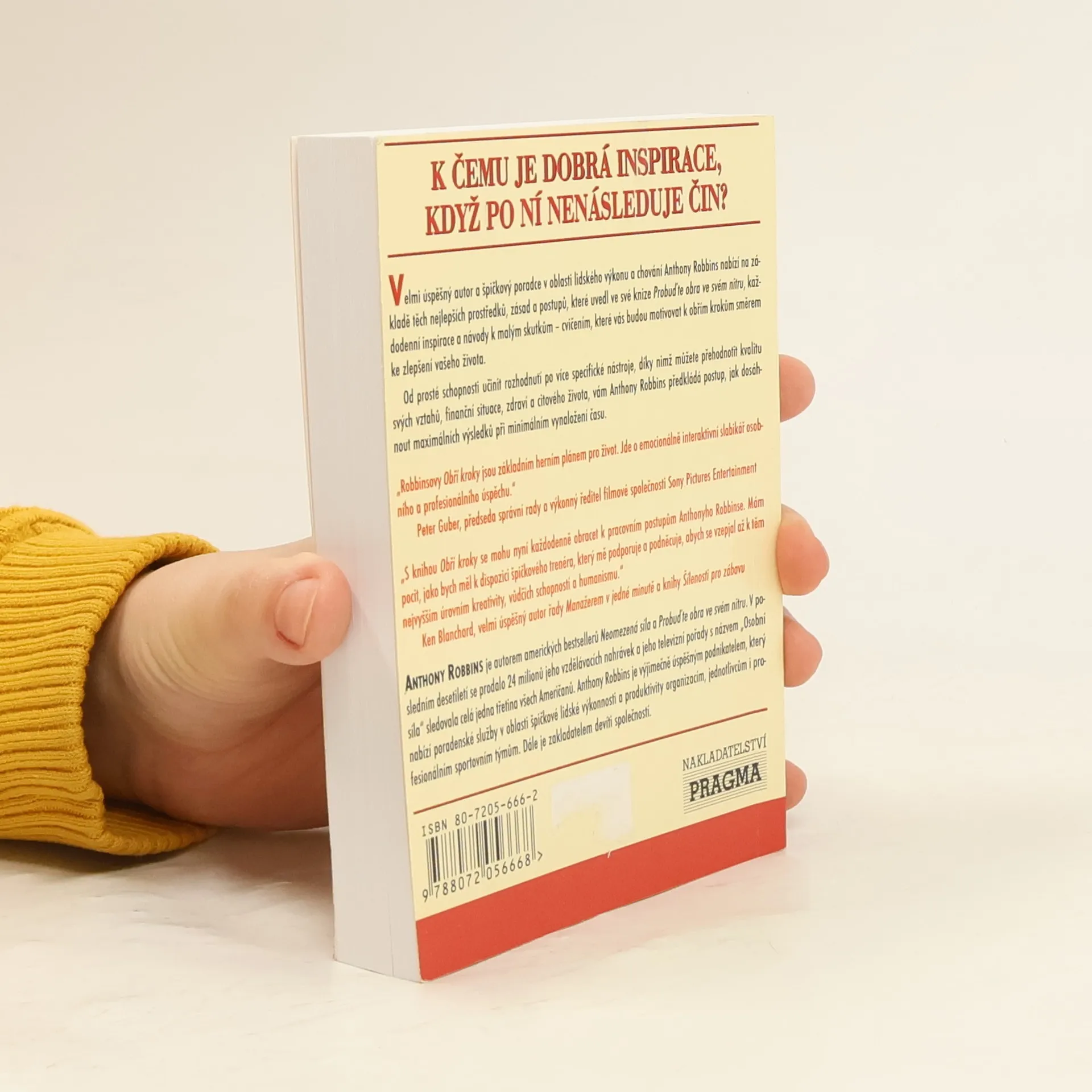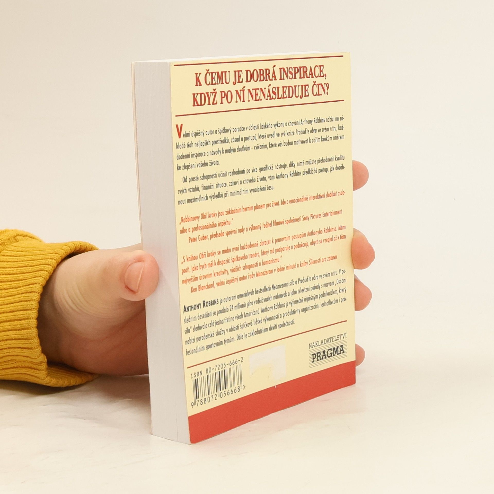 Jak dojít k velkým věcem. Malá knížka se 365 lekcemi sebeovládání na každý den roku od velkého autora. Velmi úspěšný autor a špičkový poradce v oblasti lidského výkonu a chování nabízí na základě těch nejlepších prostředlů, zásad a postupů každodenní inspirace a návody k malým skutkům - cvičením, které vás budou motivovat k obřím krokům směrem ke zlepšení vašeho života. "Robbinsovy Obří kroky" jsou základním herním plánem pro život. Jde o emocionálně interaktivní slabikář osobnosti a profesionálního úspěchu" - Peter Gruber, předseda správní rady a výkonný ředitel společnosti Sony Pictures Entertainment