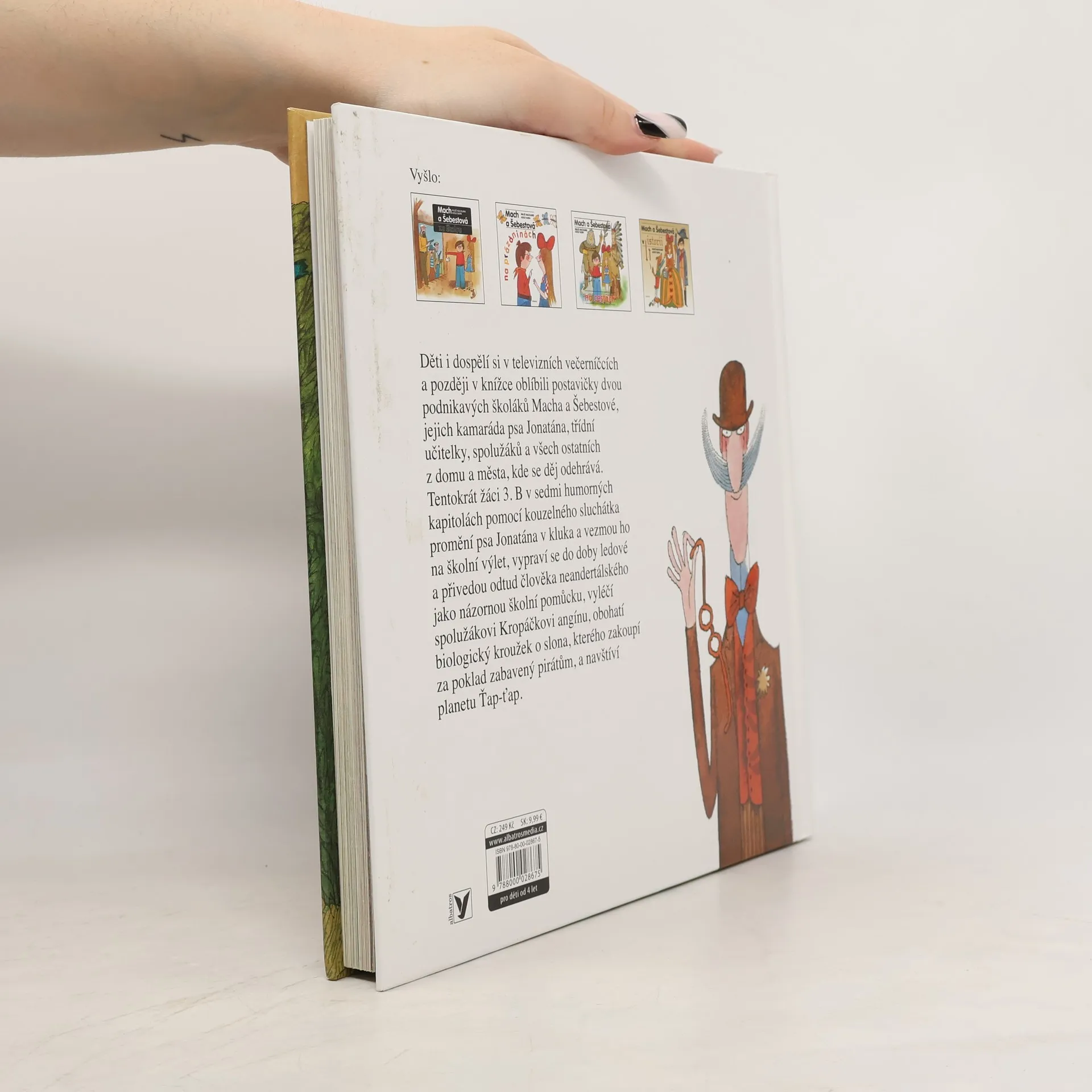 Tentokrát žáci 3. B Mach a Šebestová v sedmi humorných kapitolách pomocí kouzelného sluchátka promění psa Jonatána v kluka a vezmou ho na školní výlet, vypraví se do doby ledové a přivedou odtud člověka neandrtálského jako názornou školní pomůcku, vyléčí spolužákovi Kropáčkovi angínu, obohatí biologický kroužek o slona, kterého zakoupí za poklad zabavený pirátům a navštíví planetu Ťap-ťap.