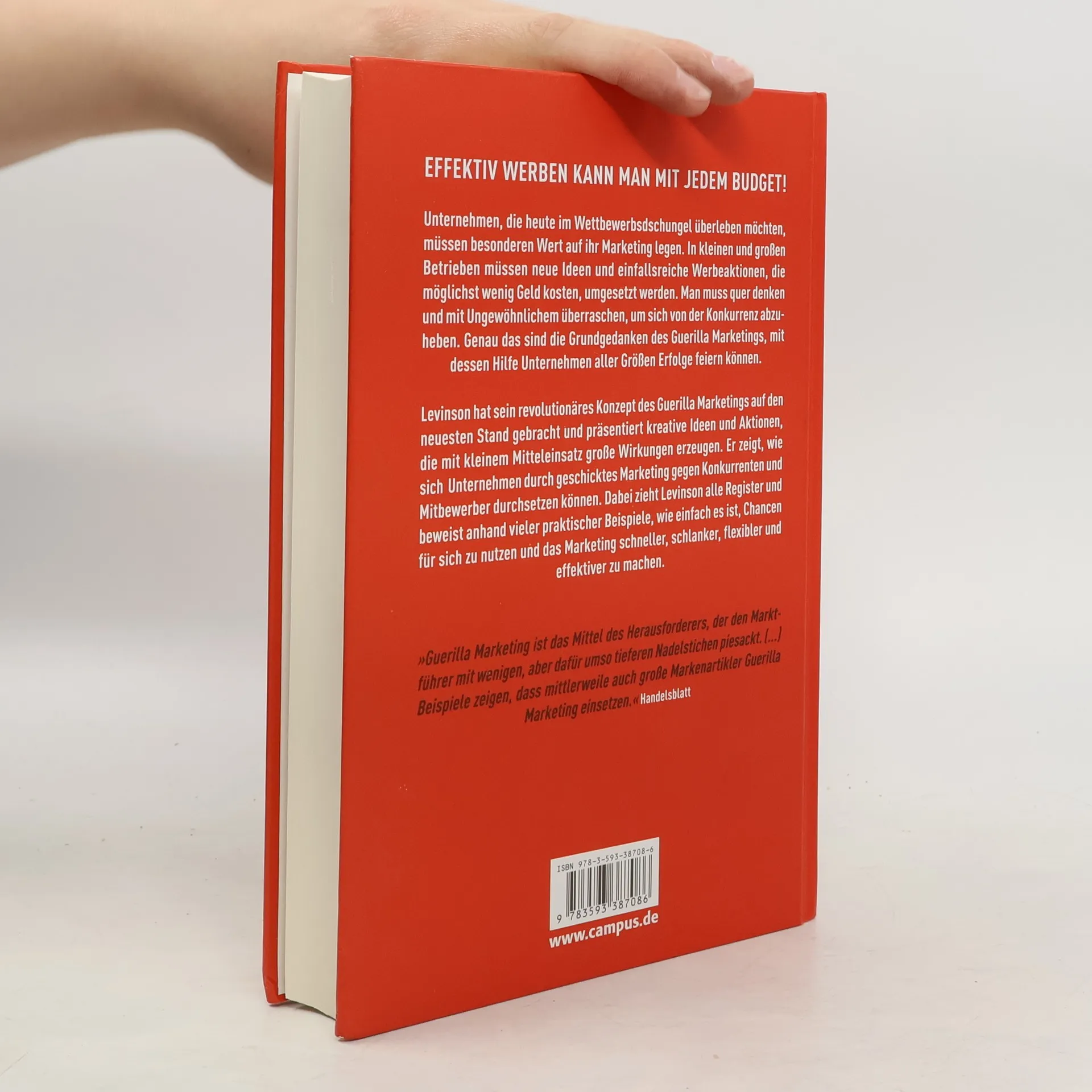 Quer denken und mit Ungewöhnlichem überraschen – das ist Guerilla Marketing, mit dessen Hilfe große wie kleine Unternehmen seit über 20 Jahren Erfolge feiern. Levinson überträgt sein revolutionäres Konzept auf die heutige Zeit und präsen- tiert jetzt noch mehr Ideen und Aktionen, die mit kleinem Mitteleinsatz große Wirkungen erzeugen. Dabei zieht Levinson alle Register und beweist anhand vieler praktischer Beispiele, wie einfach es ist, Chancen für sich zu nutzen. So wird das Marketing schneller, schlanker, flexibler und effektiver. Potenziale und Marktnischen können erkannt und besetzt werden. Für eine erfolgreiche Zukunft als Guerillero.
